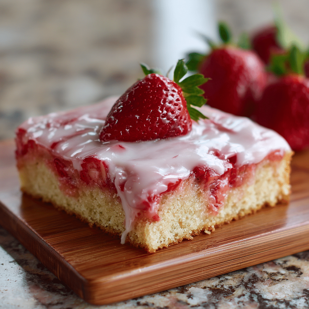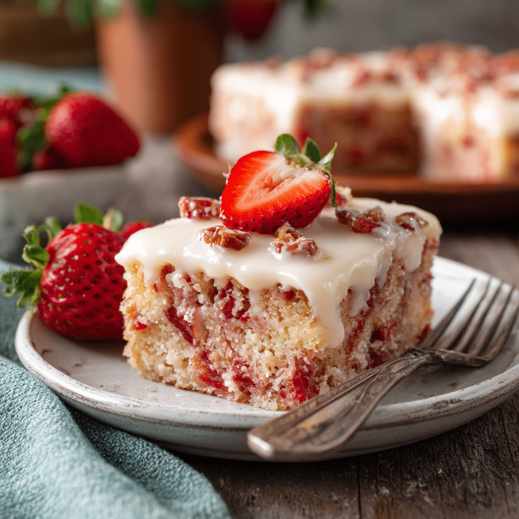 Use fresh strawberries for the best natural flavor. Do not overmix the batter to keep the cake soft. Frost while the cake is slightly warm for extra moisture. Store covered at room temperature for 2 days or refrigerate up to 4 days.