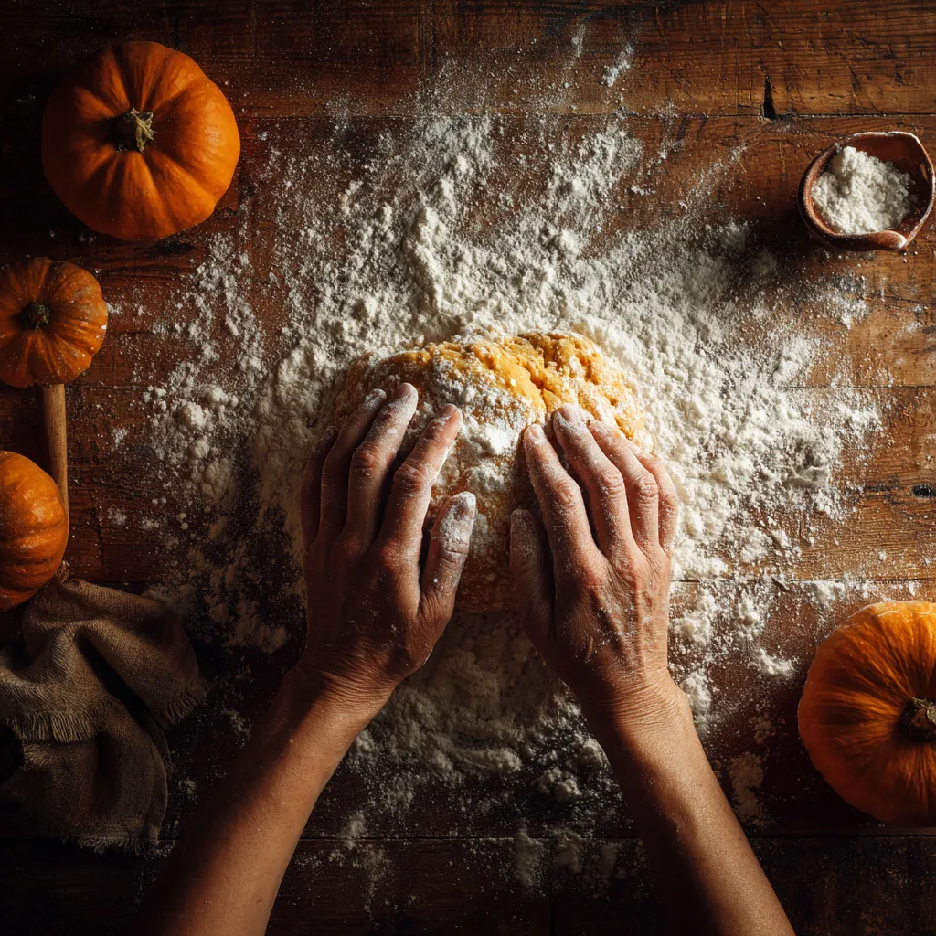 Add pumpkin purée, egg, butter, and spices. Gradually add flour and salt. Knead for 8–10 minutes until smooth and elastic. Cover and rest 1 hour.Roll & Fill: