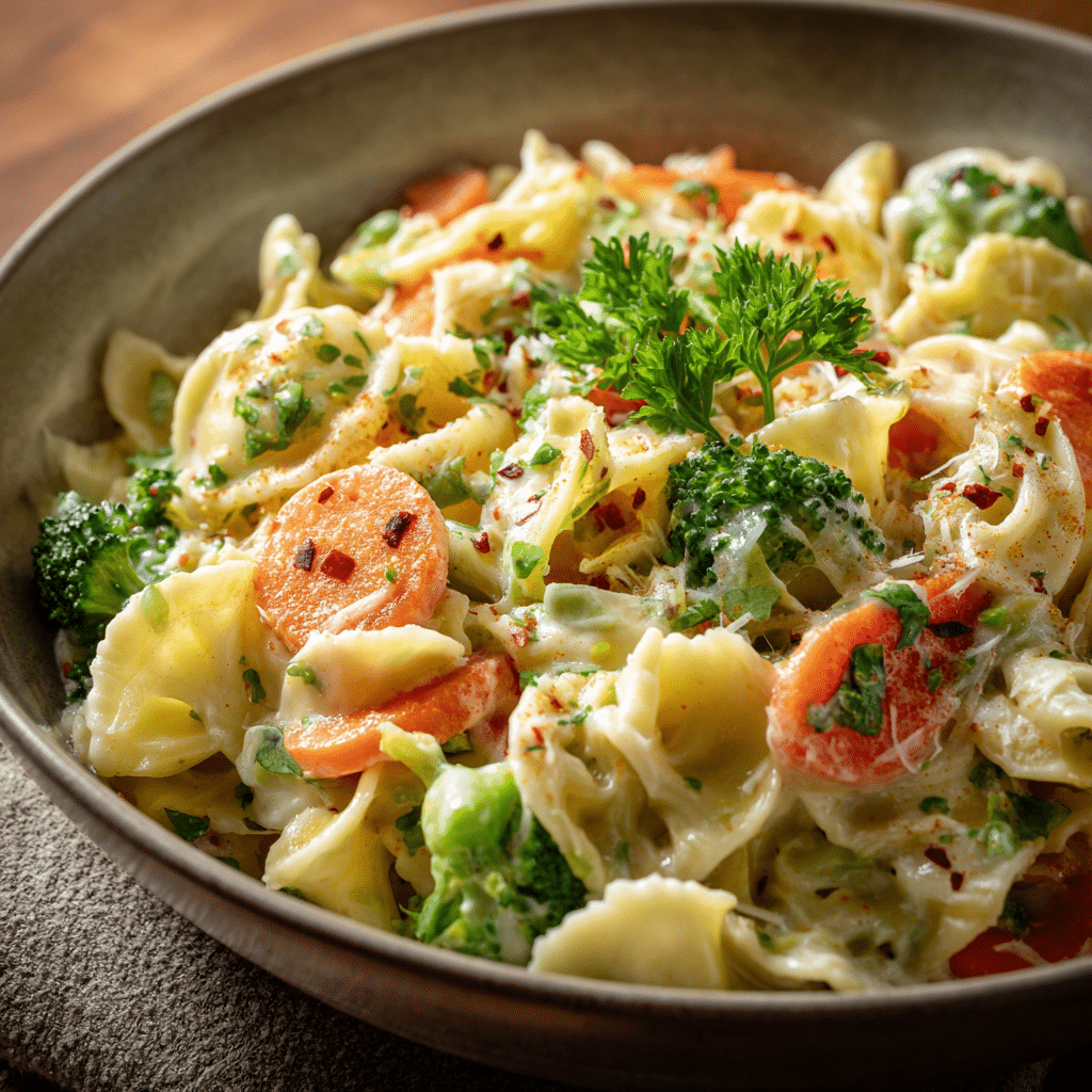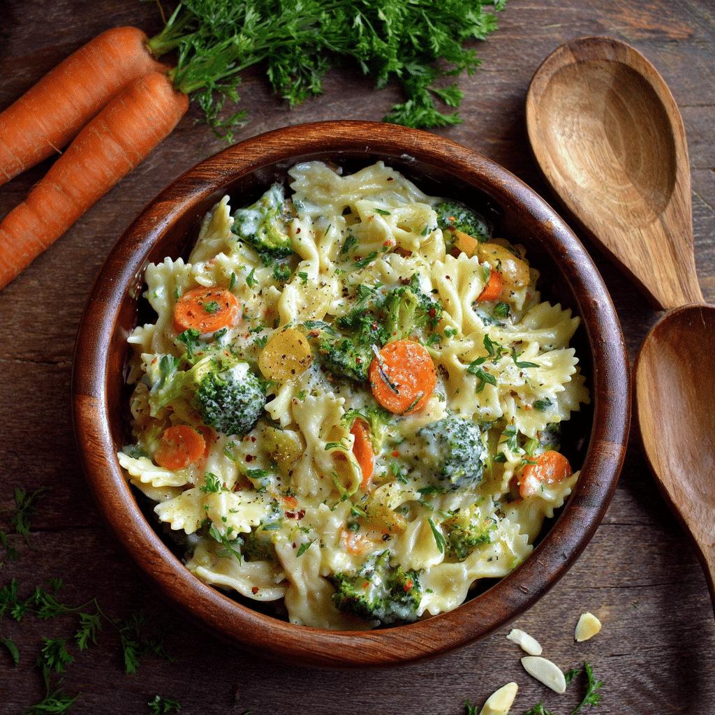 My little kitchen secret is cooking the vegetables just until tender. I never let them turn mushy. I also save a cup of pasta water because it helps loosen the sauce and makes it silky instead of heavy.
