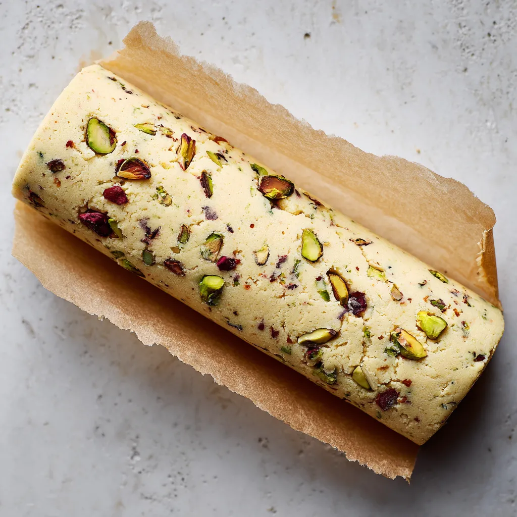 Turn the dough onto a piece of parchment paper. Shape it into a log about 2 inches thick, or flatten it into a disc if you prefer cutting shapes with cookie cutters. Wrap tightly and refrigerate for at least 1 hour. Chilling makes the dough easier to slice and helps your Pistachio Holiday Shortbread maintain its shape while baking.