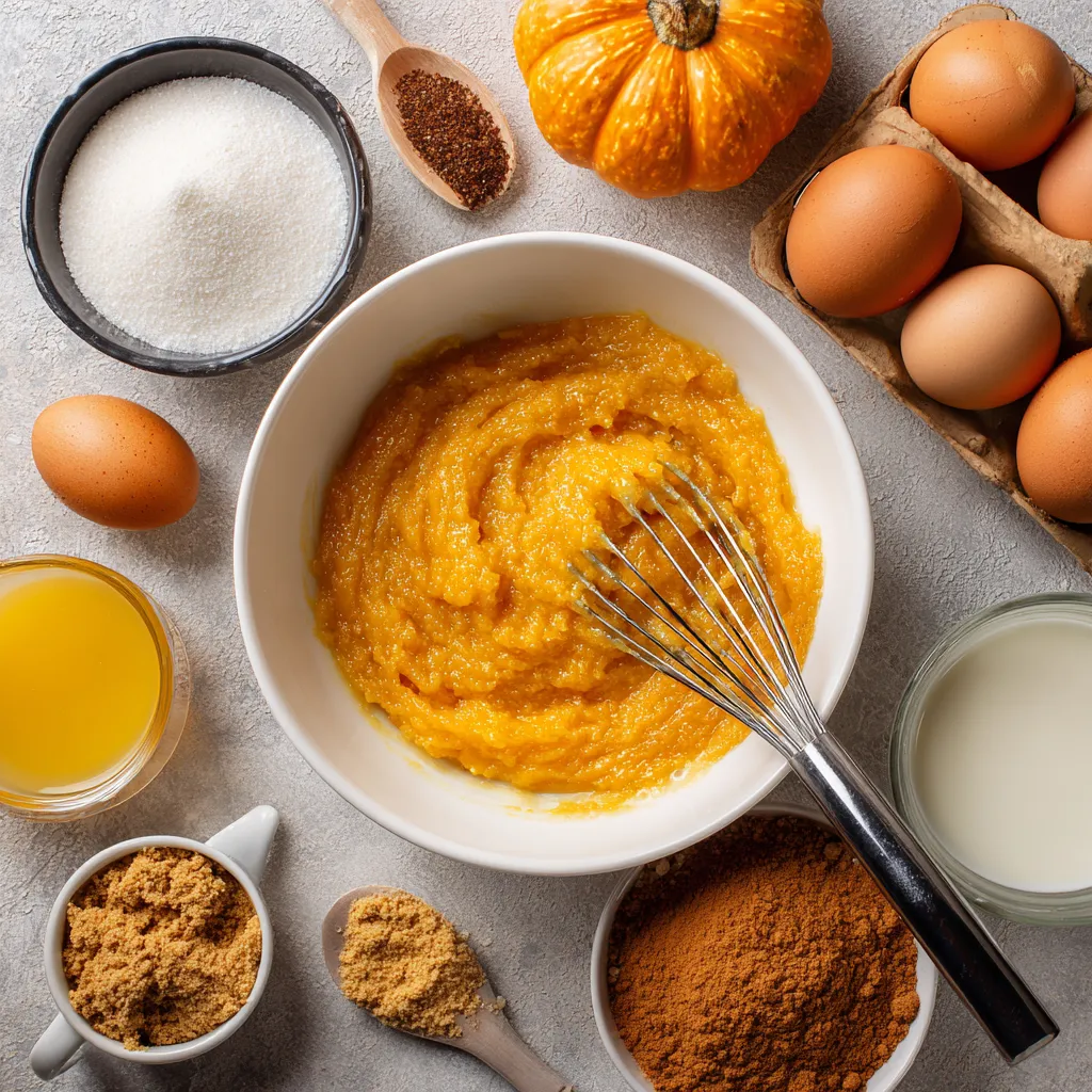 In another bowl, whisk together pumpkin puree, eggs, oil, granulated sugar, brown sugar, milk, and vanilla until smooth and well combined.
