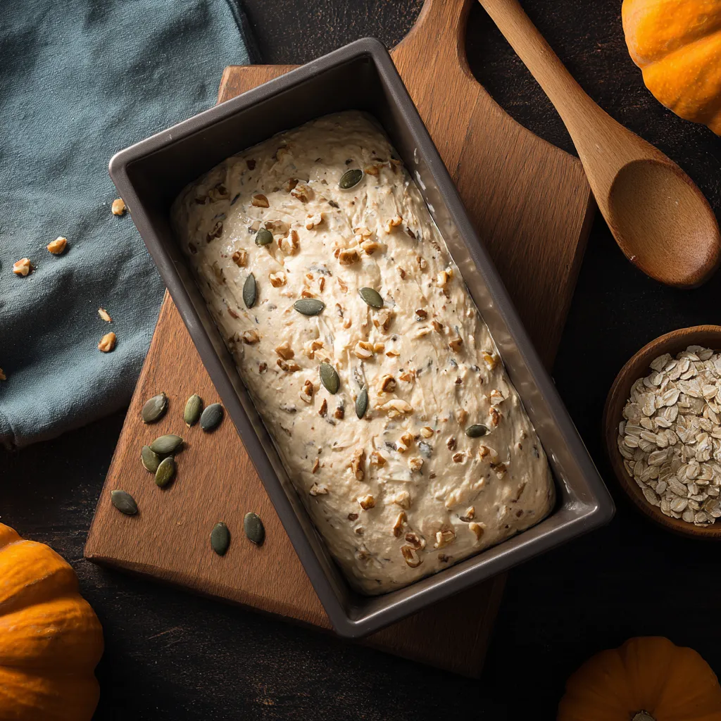 Pour the batter into the prepared loaf pan. Sprinkle pumpkin seeds or chopped nuts on top for a rustic look. Bake for 55–65 minutes, or until a toothpick inserted in the center comes out clean.