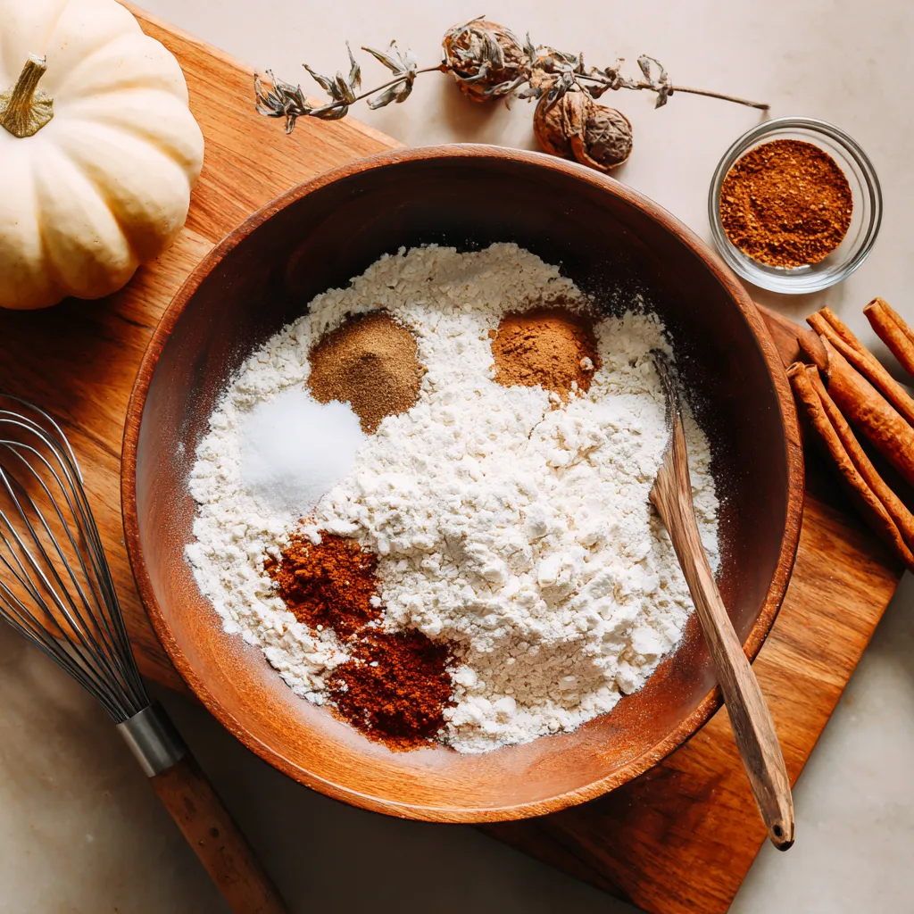 In a medium bowl, whisk together flour, baking soda, baking powder, salt, and all the spices (cinnamon, nutmeg, cloves, and ginger). This blend is what gives your pumpkin bread that irresistible aroma!
