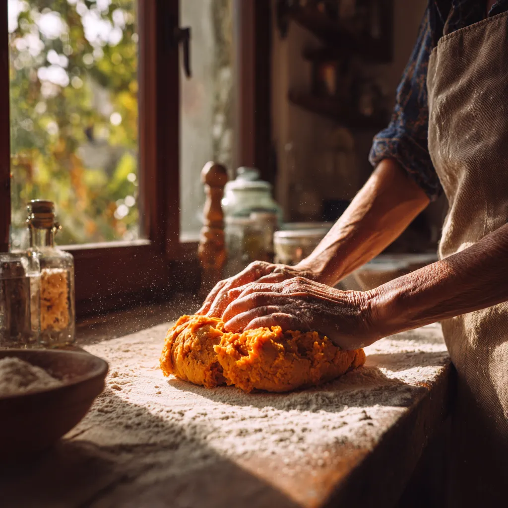 In a large mixing bowl, whisk pumpkin puree, melted butter, egg, and sugar. Add the activated yeast mixture. Slowly add flour, salt, and spices. Knead for 8–10 minutes until smooth and elastic. Cover and let rise in a warm place for 1 hour, or until doubled in size.