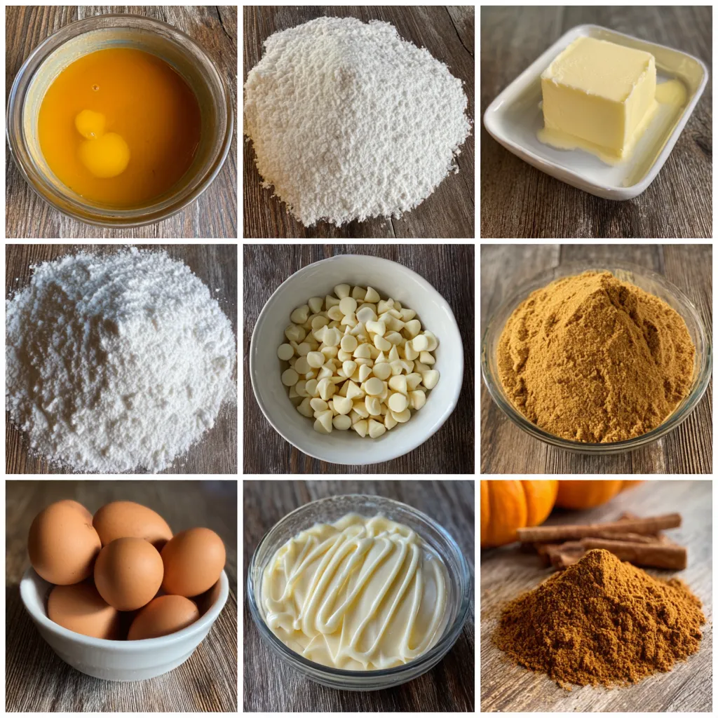 Pumpkin puree, flour, yeast, sugar, butter, spices, milk, white chocolate, heavy cream