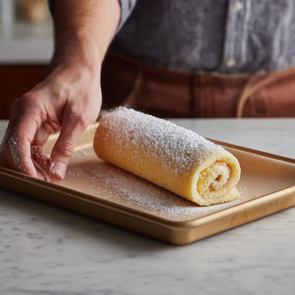 While the cake is still warm, carefully lift it with the parchment paper and place it on a clean kitchen towel dusted with powdered sugar. Gently roll the cake up from the short end (towel and all). Let it cool completely.