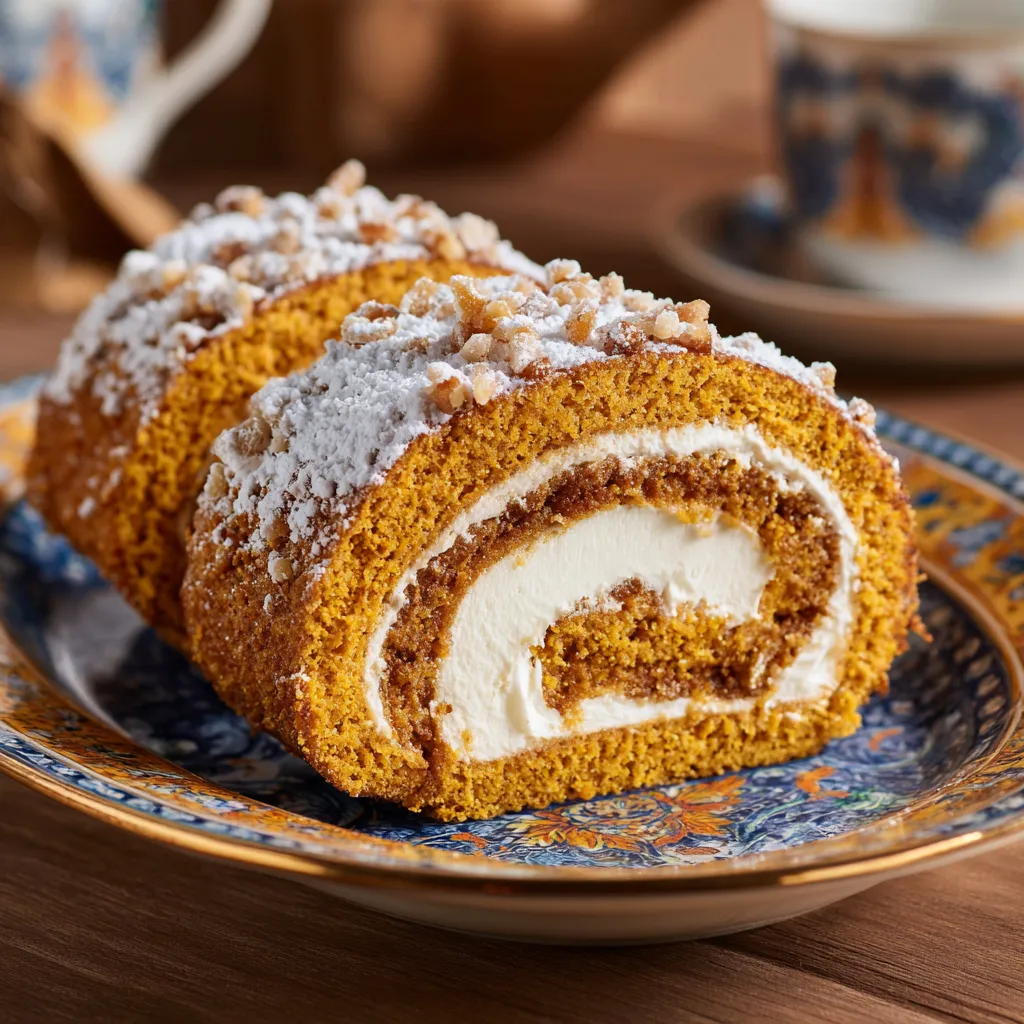 Hi, Iโm Inaya from Crete! This Pumpkin Roll with Cream Cheese Filling is my go-to fall dessert soft, spiced pumpkin sponge wrapped around a tangy cream cheese swirl. Itโs simple yet elegant, perfect for holidays or cozy weekends. Roll the cake while warm, chill before slicing, and youโll have a dessert that looks as good as it tastes. Serve it with Greek coffee or spiced tea for the ultimate comfort. With warm cinnamon, nutmeg, and a creamy filling, this pumpkin roll brings autumn straight to your table. ๐