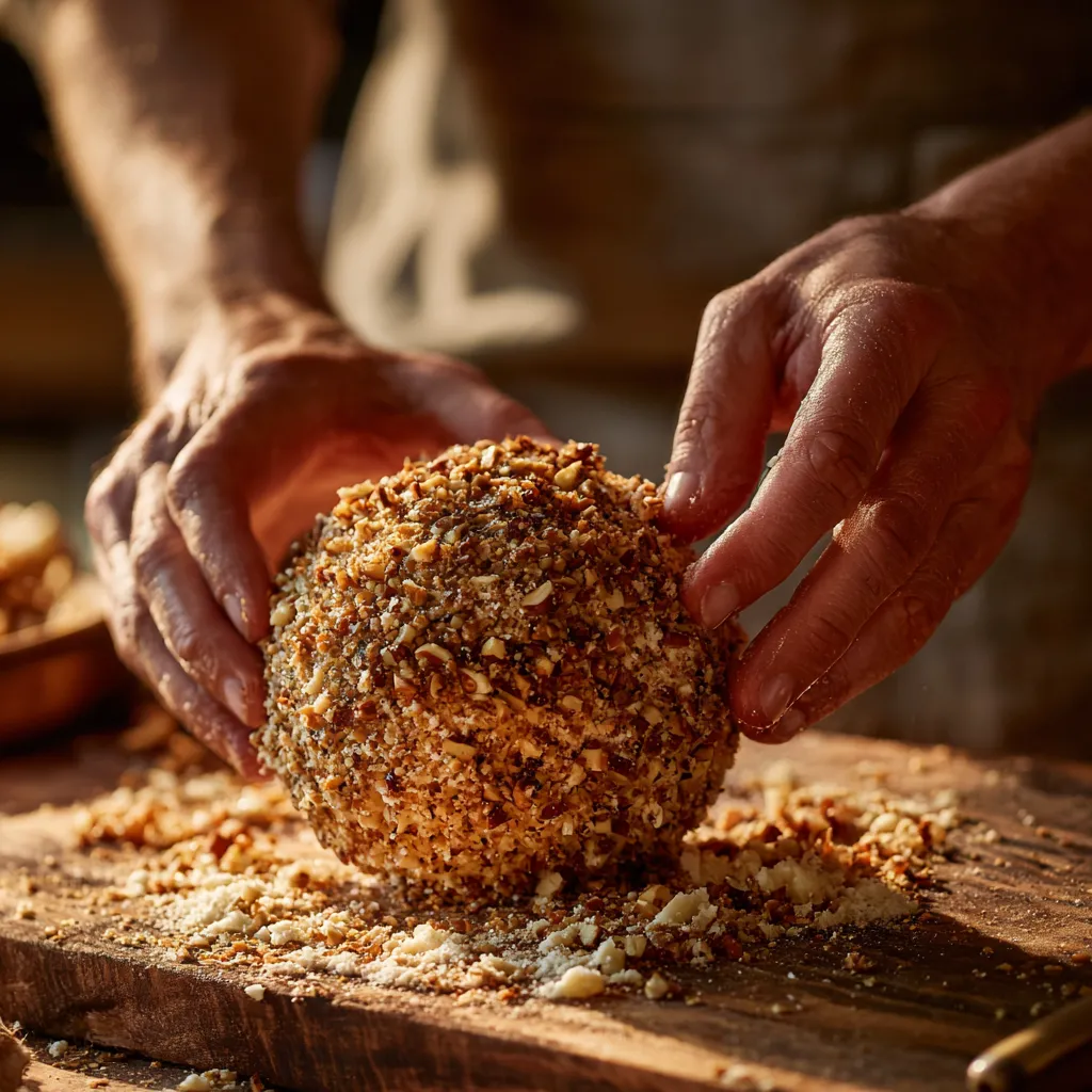 Remove the twine and roll the cheese ball in finely chopped spiced nuts, pressing gently so they stick to the surface. This gives the ball crunch, flavor, and a rustic pumpkin look.