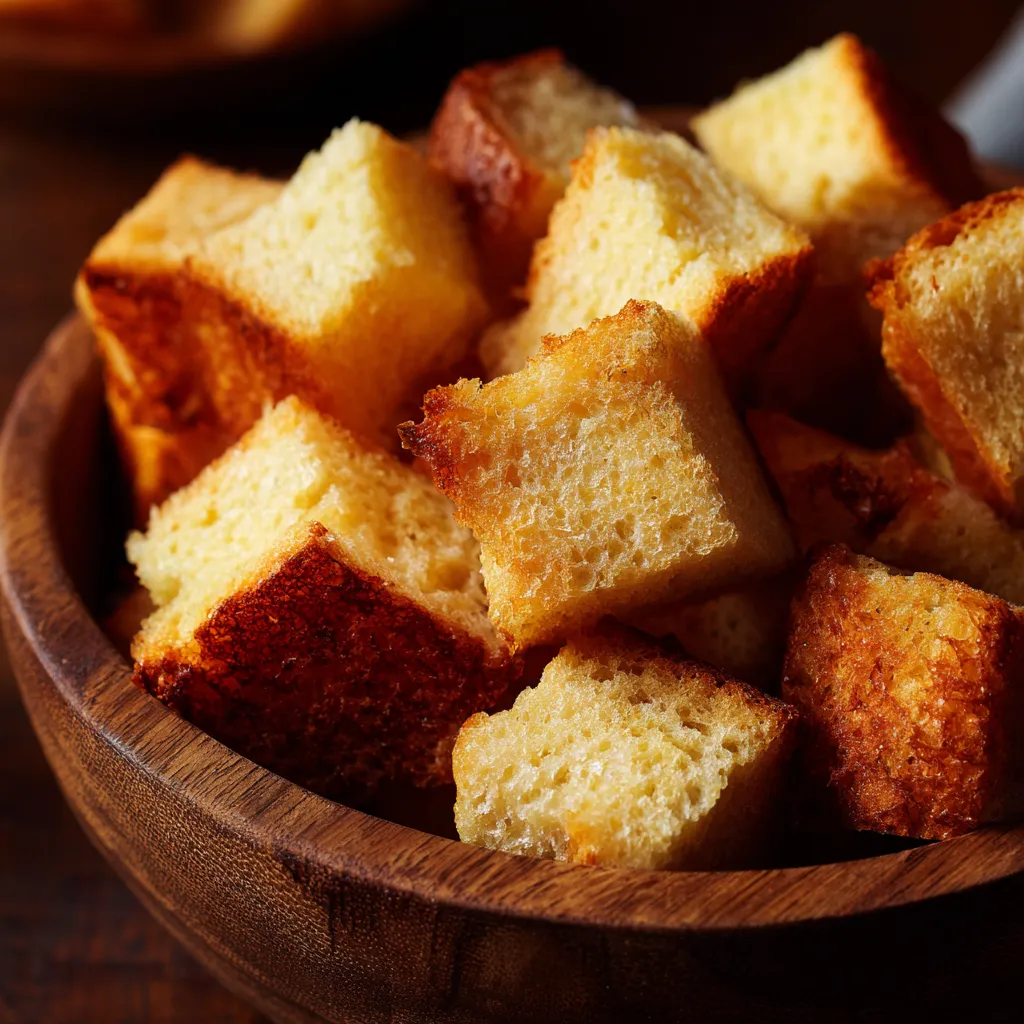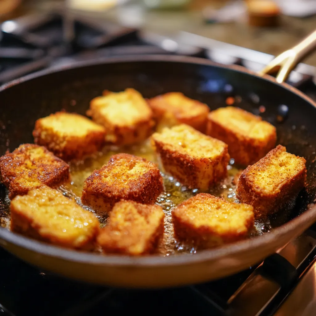 Melt butter in a large nonstick skillet over medium heat. Add the soaked bread cubes in batches, cooking each side until golden brown and slightly crispy (about 2–3 minutes per side).