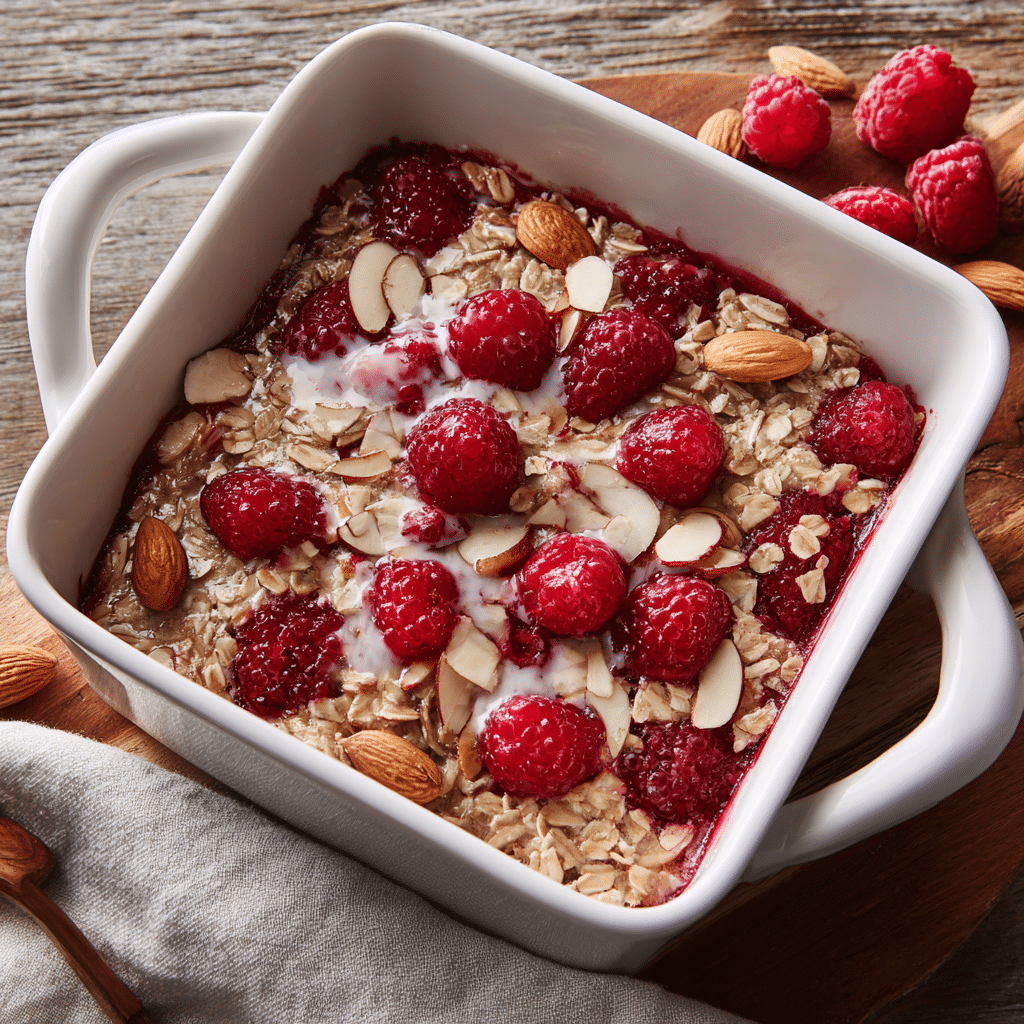 This Raspberry Almond Oatmeal Bake is a cozy, nourishing breakfast made with rolled oats, juicy raspberries, and crunchy almonds. Lightly sweetened and baked until golden, it’s perfect for slow mornings, family brunches, or healthy make-ahead breakfasts that feel like home.