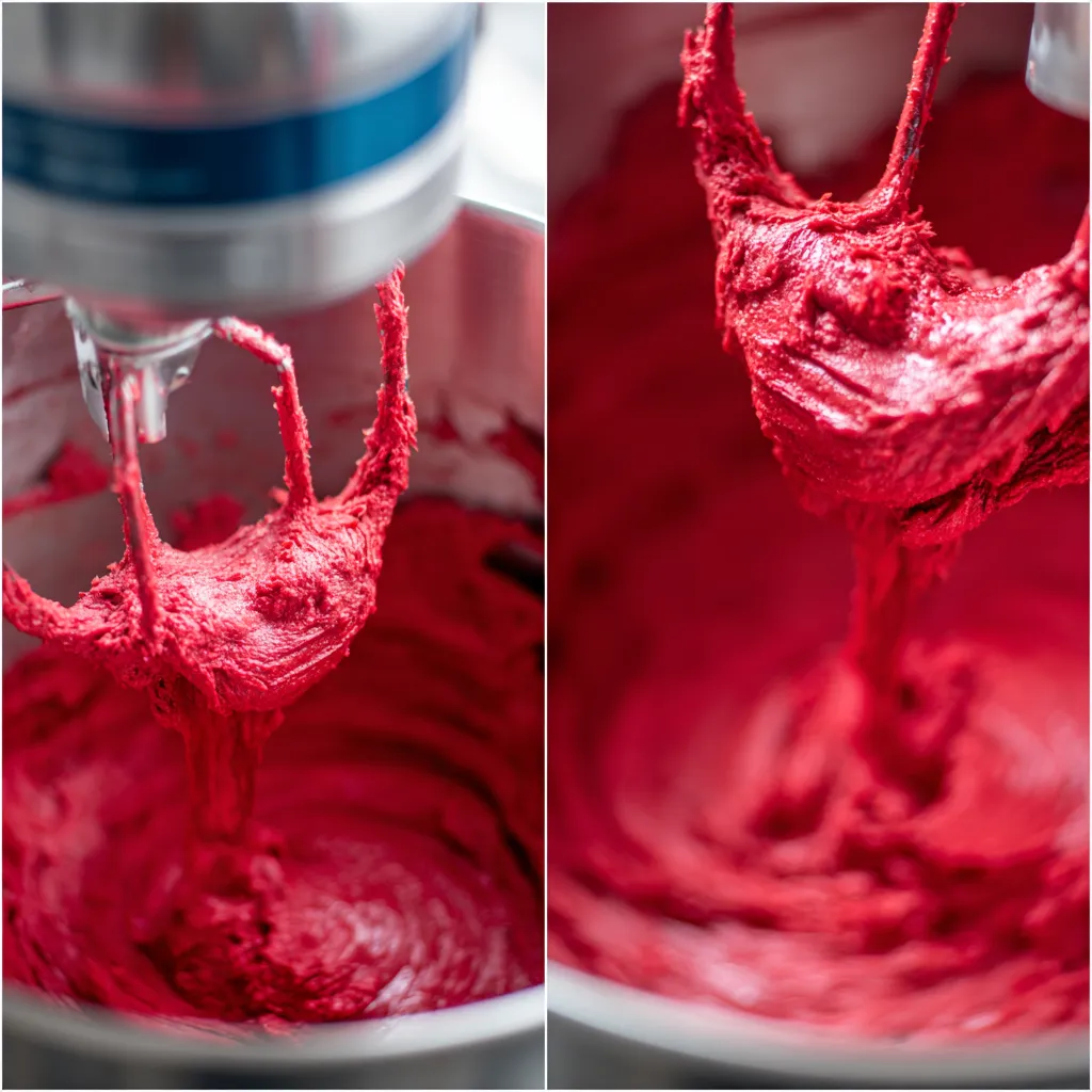 Add egg, vanilla, and red food coloring. Mix until smooth and vibrant.