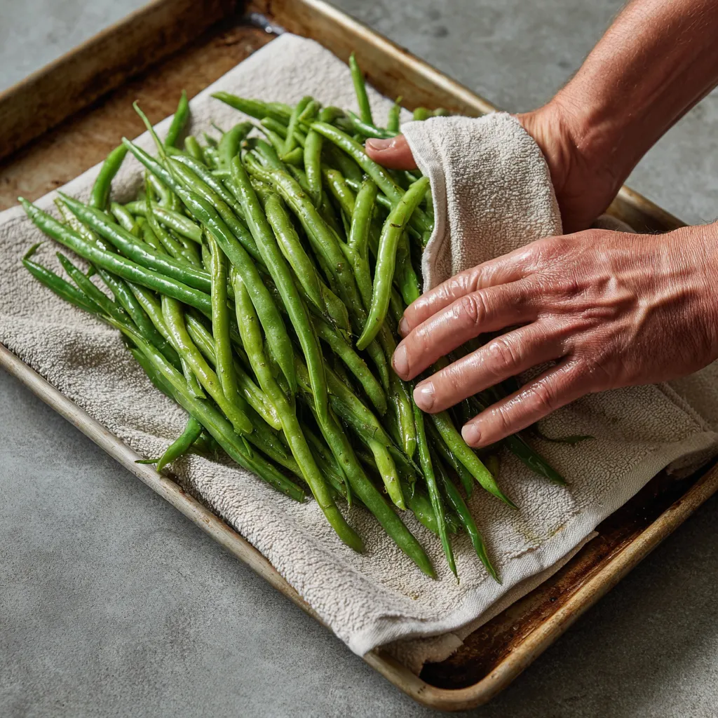 Rinse and trim the ends of the green beans. Pat them dry with a clean towel this ensures they roast instead of steam.