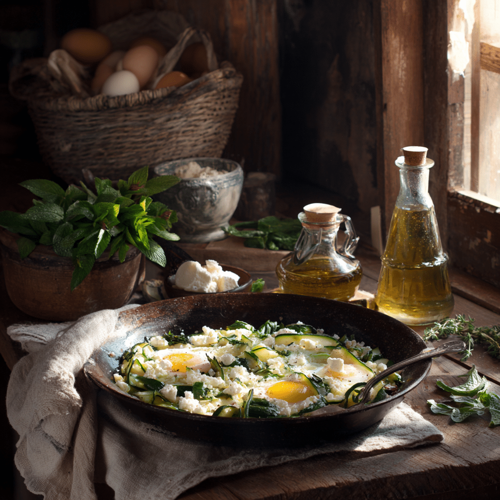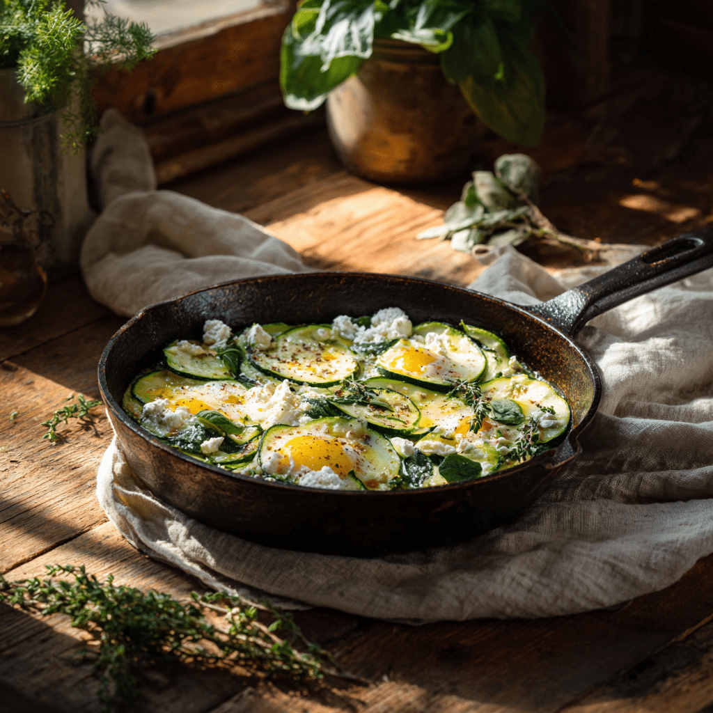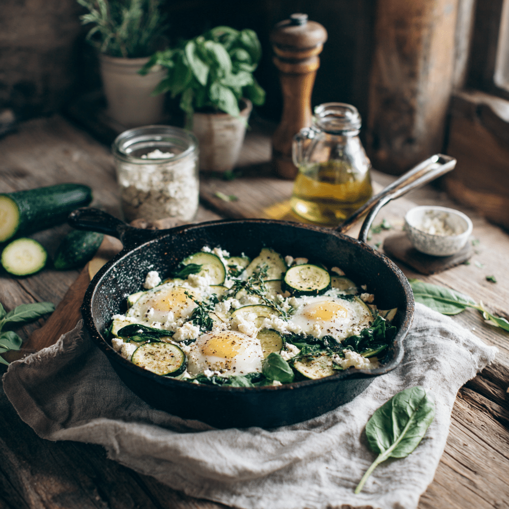 This simple low carb skillet recipe brings together fresh vegetables, eggs, olive oil, and feta for a comforting Greek-inspired meal that feels nourishing and satisfying.