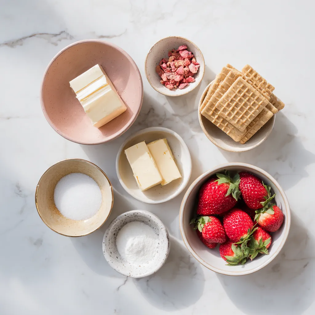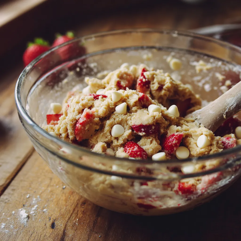 Cream together butter, white sugar, and brown sugar until light and fluffy (about 2–3 minutes). Add eggs one at a time, then mix in vanilla extract. In another bowl, whisk flour, baking powder, baking soda, and salt. Gradually combine dry and wet ingredients until a soft dough forms. Gently fold in crushed freeze-dried strawberries and white chocolate chips.