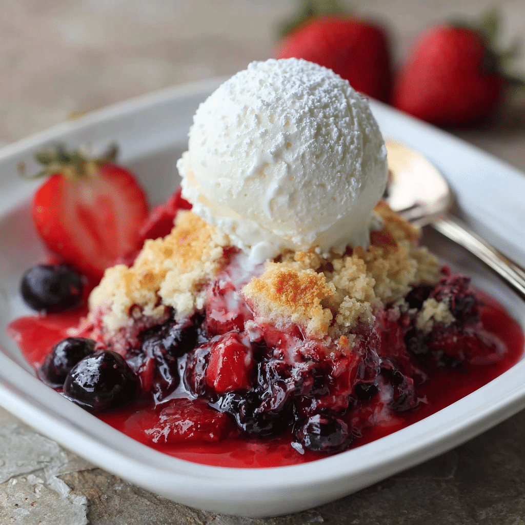 Fresh berries give the brightest flavor, but frozen berries work too—use them straight from frozen and add 5–10 minutes of baking time. If you like a thicker filling, stir 1–2 teaspoons of cornstarch into the sugar before tossing with the berries. For extra crunch, sprinkle 1/2 cup chopped almonds or pecans over the buttered cake mix before baking. Store leftovers covered in the fridge for up to 4 days; reheat single servings in the microwave (30–45 seconds) or warm the pan in a 325°F (160°C) oven for 10–15 minutes. Freeze tightly wrapped portions for up to 2 months and thaw overnight in the refrigerator.