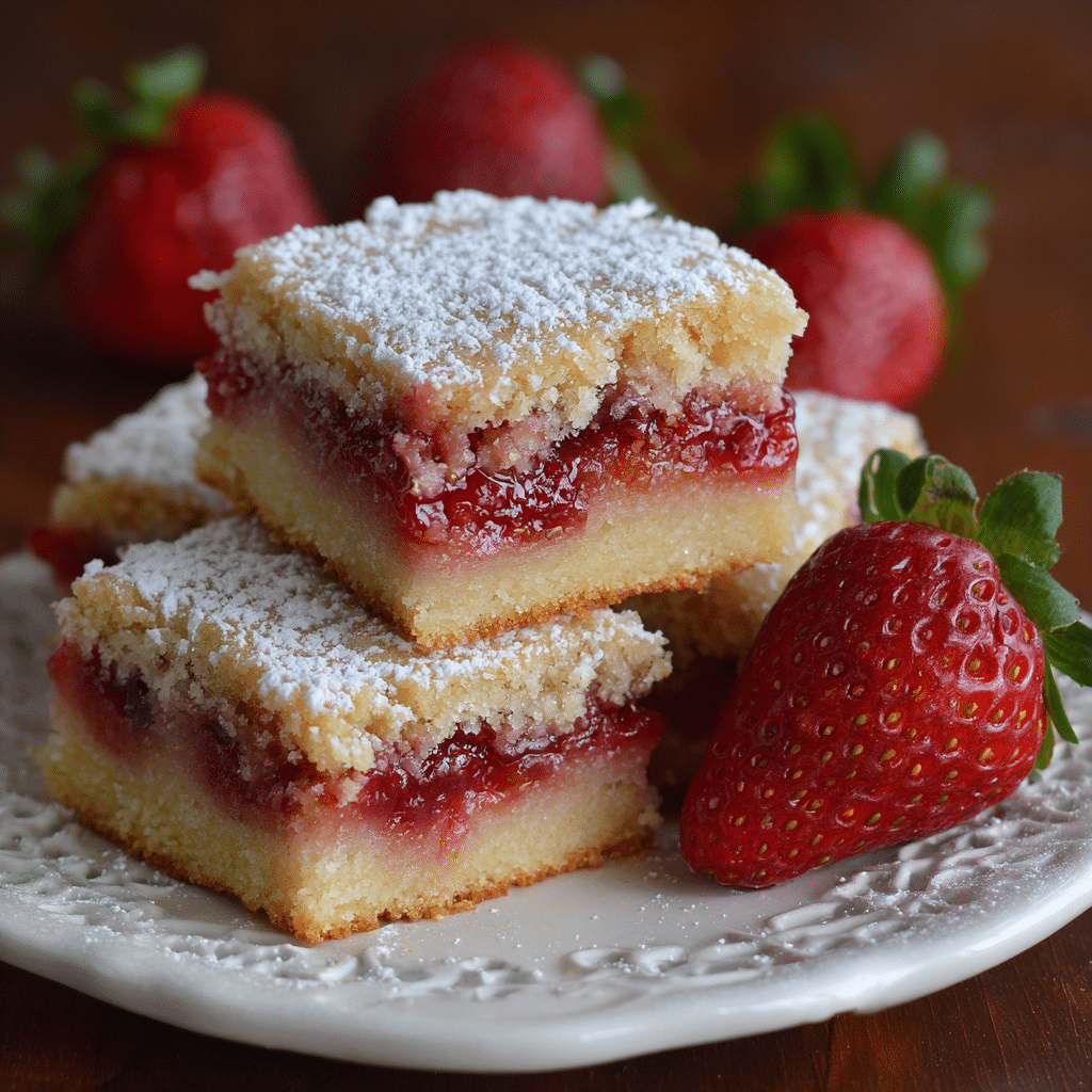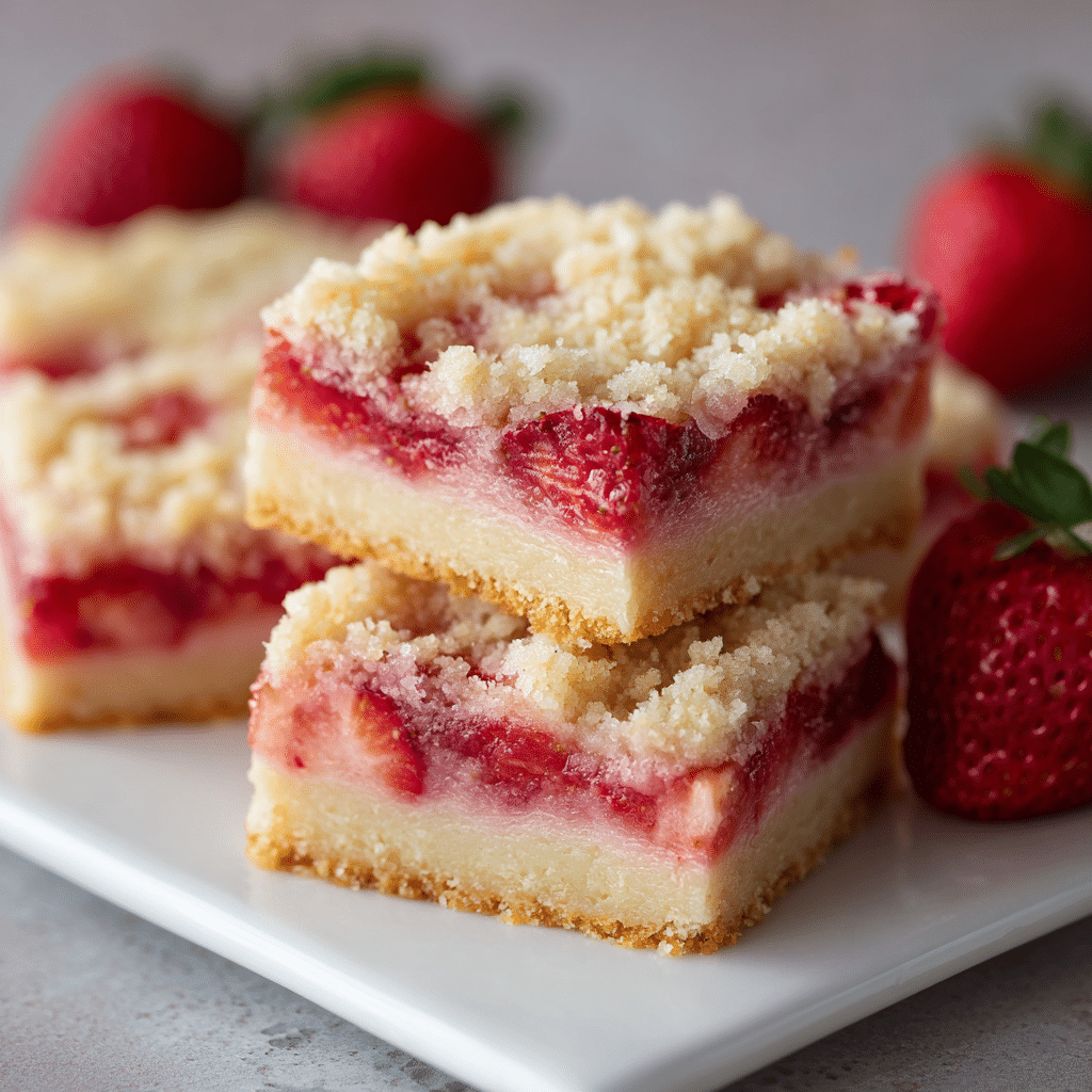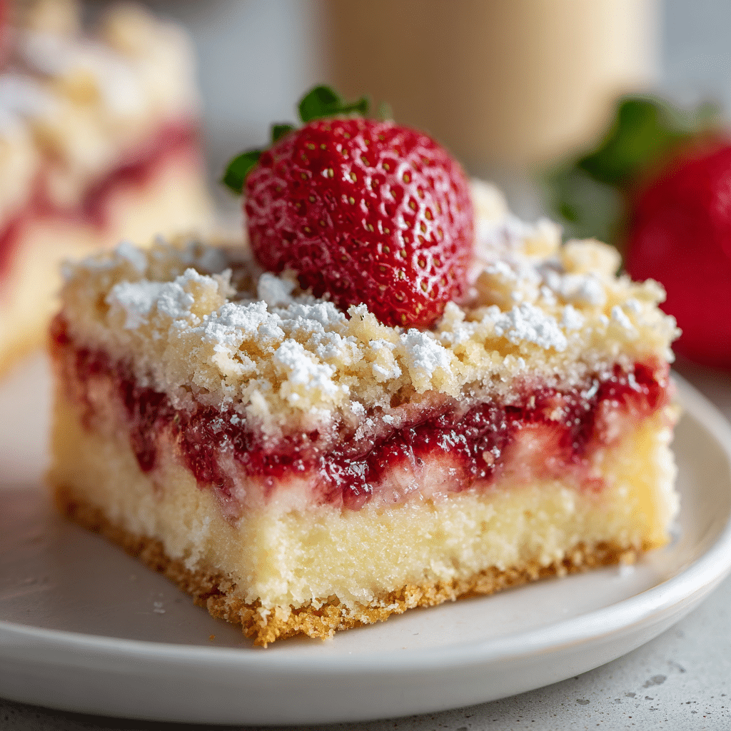 For the best flavor, use ripe, fragrant strawberries. If your berries are very sweet, reduce the filling sugar by 1–2 tablespoons. Cool the filling fully before layering so it stays neatly in the middle. Don’t overmix the batter—mixing only until combined keeps the cake tender. Store bars covered in the refrigerator for up to 4 days; let them sit at room temperature for 15–20 minutes before serving for the softest texture. Freeze sliced bars tightly wrapped for up to 2 months and thaw overnight in the fridge.