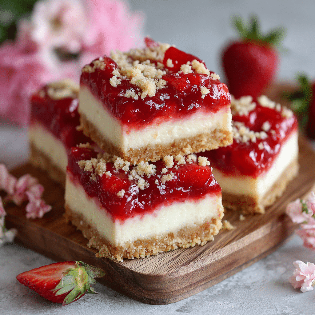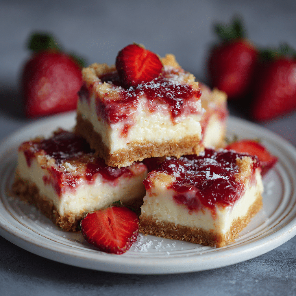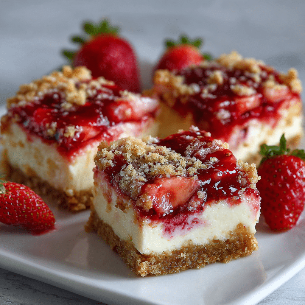 For the smoothest cheesecake, use room-temperature cream cheese and eggs. Chill overnight for clean slices. Store bars covered in the fridge for up to 4 days. If you want to freeze, freeze the plain cheesecake base (without strawberry topping) tightly wrapped for up to 2 months; thaw overnight in the fridge and add fresh topping before serving.