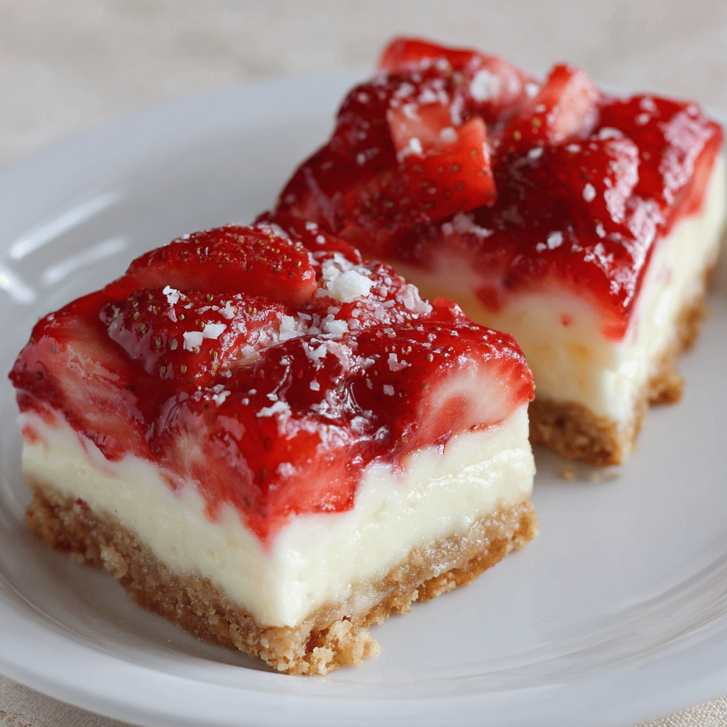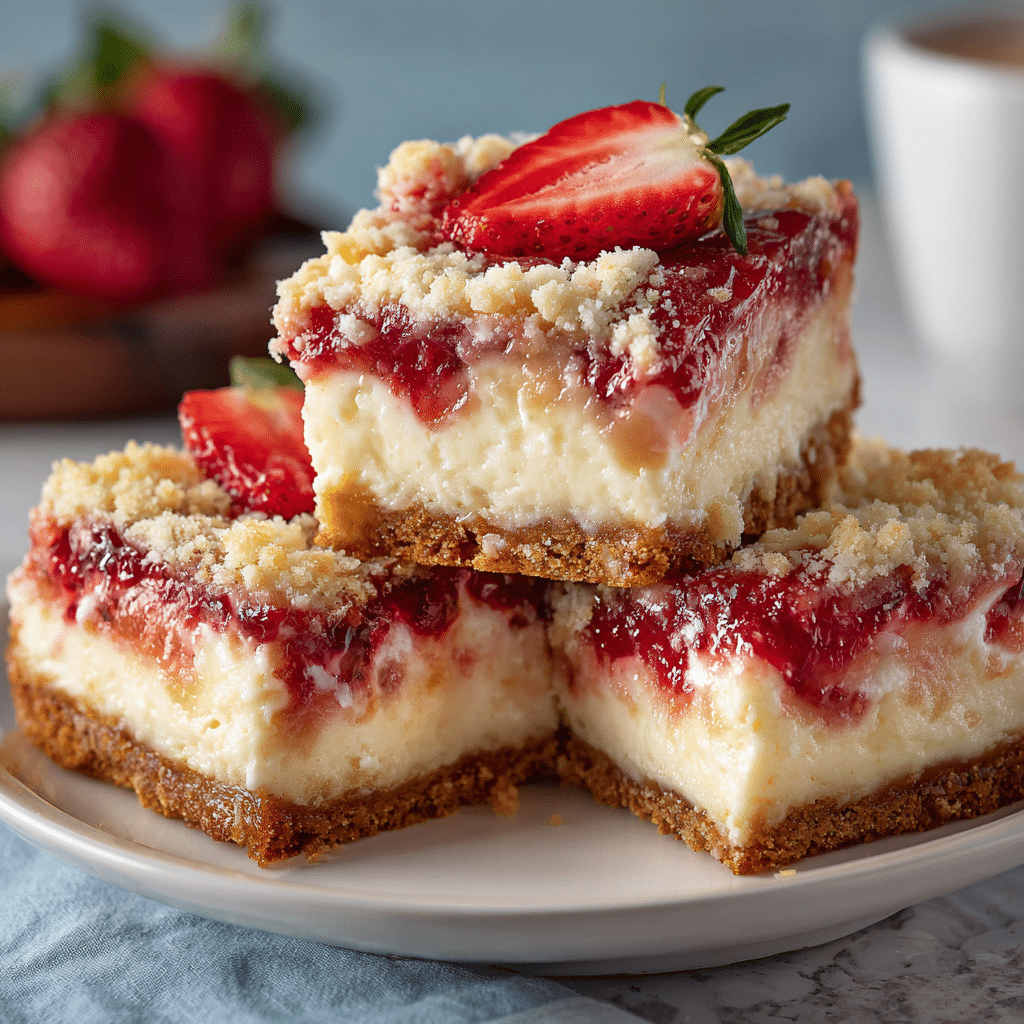 I make Strawberry Cream Cheese Cake Bars with a buttery crust, creamy cheesecake filling, and sweet strawberry swirl. I cook fresh strawberries with sugar and lemon, press a simple crust into a pan, and top it with smooth cream cheese batter. I swirl the strawberry mixture gently and bake until set. After chilling for several hours, I slice into beautiful bars. These bars taste rich, fruity, and refreshing. I serve them cold for the best texture. They store well in the fridge and freeze beautifully. This easy dessert always brings smiles to my table.