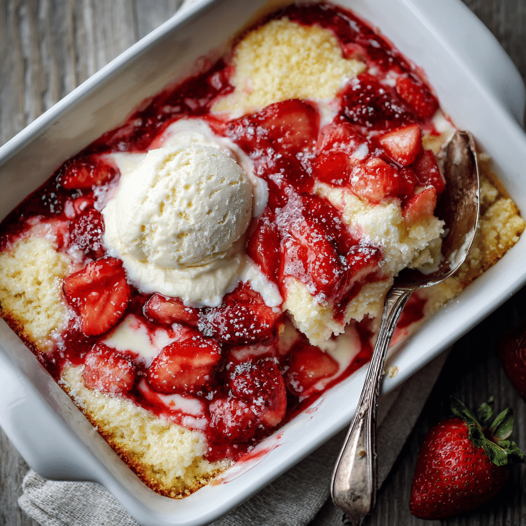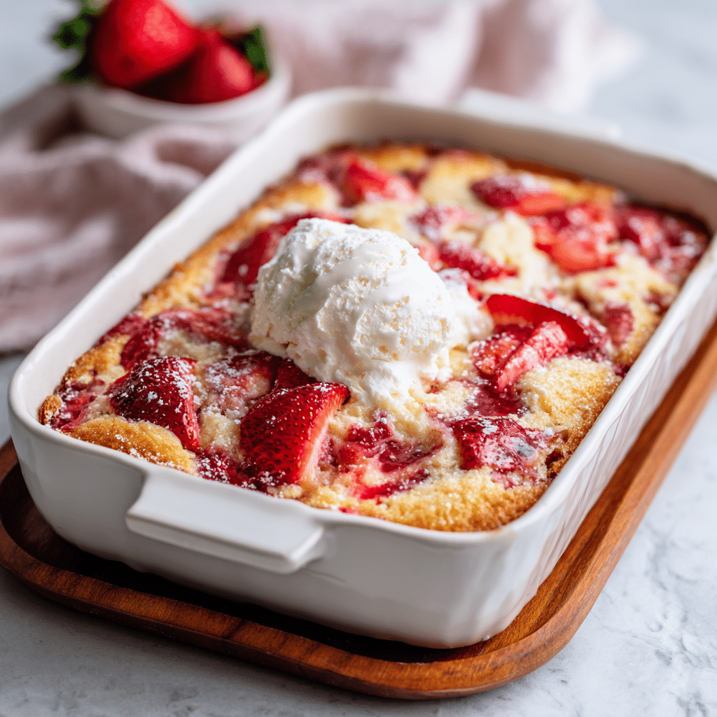 The strawberries bring brightness and sweetness. The cream cheese melts into little pockets of creamy richness. The cake mix forms a golden crust that feels almost like a cobbler topping. Every bite gives you fruit, creaminess, and buttery crumble.