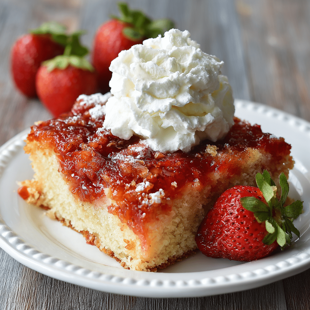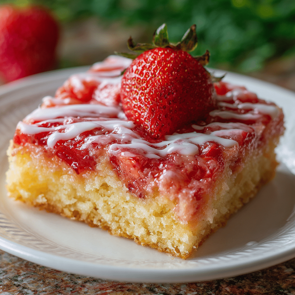 For extra flavor, add a handful of white chocolate chips or sliced almonds before baking. Frozen strawberries can be used—just thaw and drain excess liquid first. Store leftovers covered in the refrigerator for up to 4 days and reheat individual slices in the microwave for 20–30 seconds. This cake also freezes well for up to 2 months.