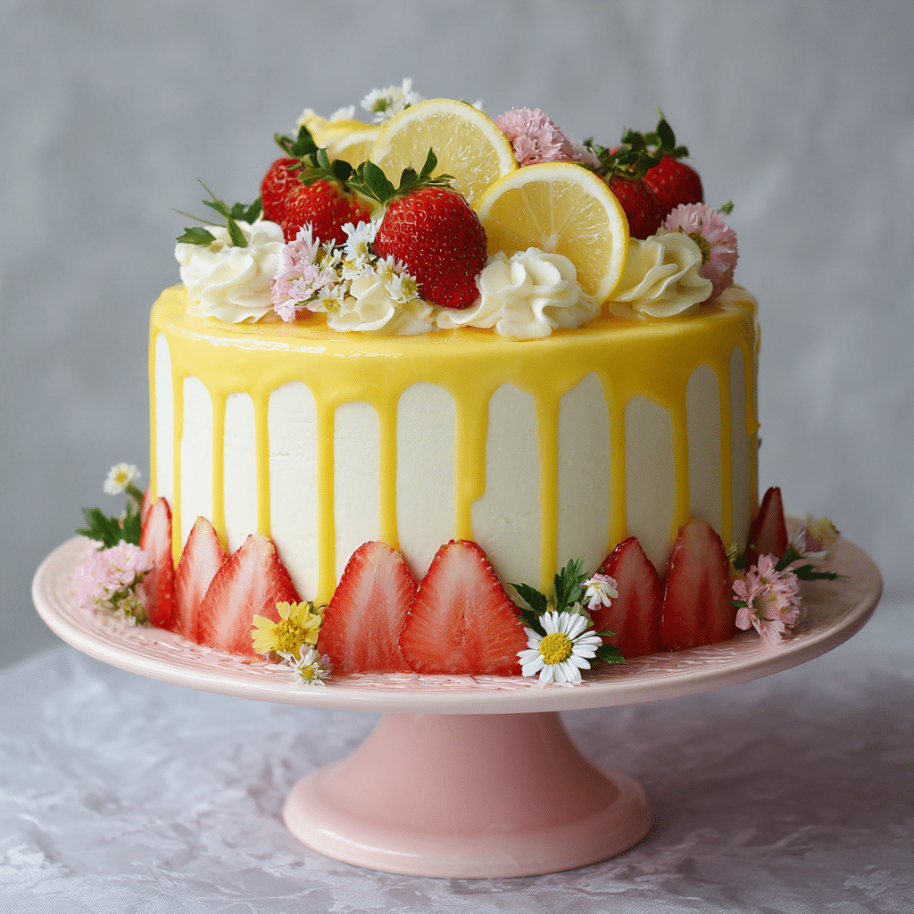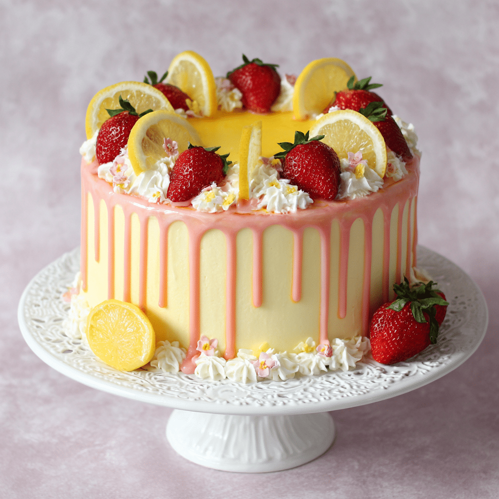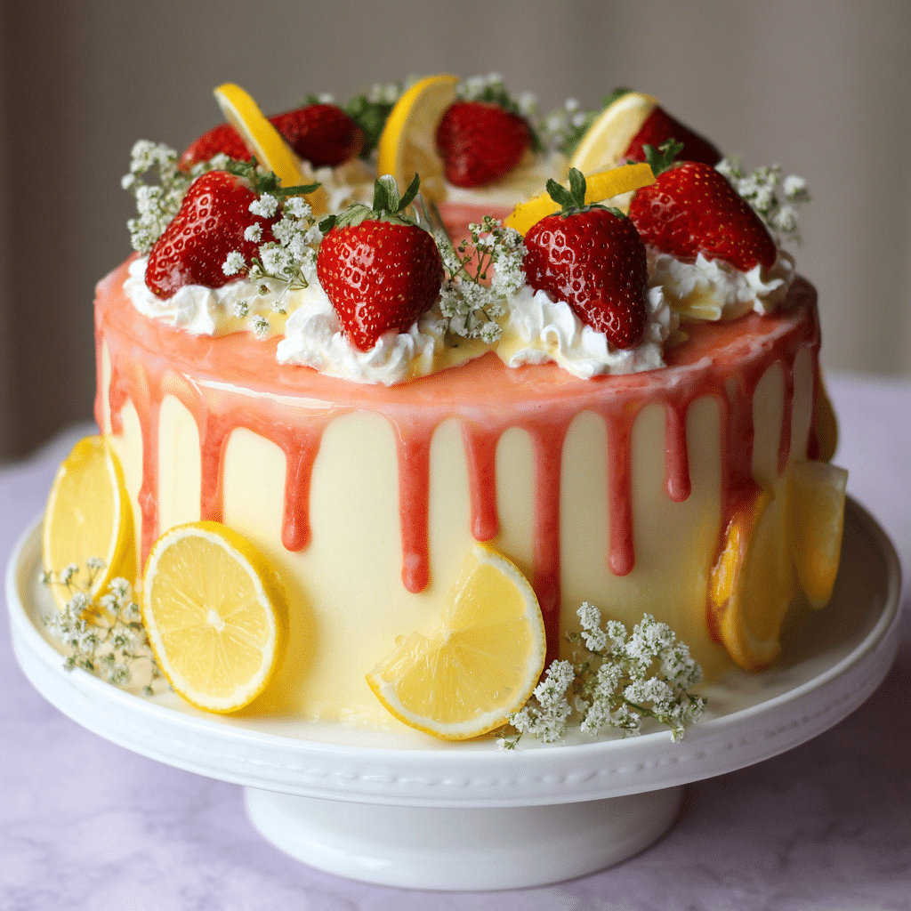Use fresh lemons for the brightest flavor. Strain the strawberry puree for a smooth texture. Chill the cake before adding the lemon drip to control the flow. Store covered in the refrigerator for up to 3 days and bring to room temperature before serving.