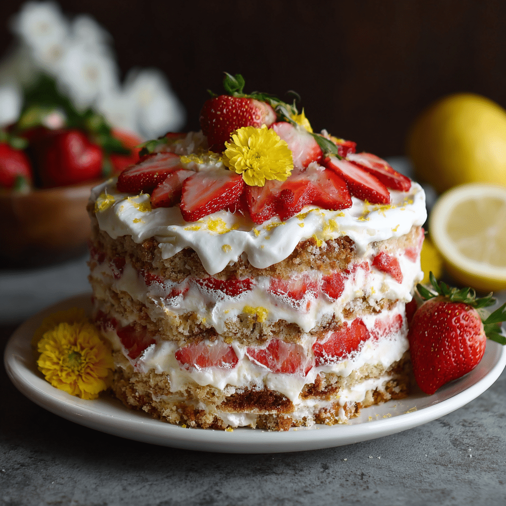 I love how Strawberry Lemon Icebox Cake looks when I cut into it. The layers shine: red strawberries, pale cream, golden cookies softened into cake-like tenderness. Every bite tastes like sunshine and laughter.