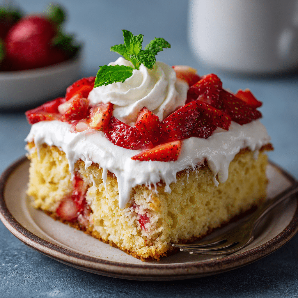I bake a light sponge cake, soak it in a sweet mixture of three milks with fresh lemon juice, and chill it until creamy and moist. I top it with fluffy whipped cream and fresh strawberries. Strawberry Lemon Tres Leches Cake tastes bright, sweet, and refreshing. The lemon zest adds freshness, and the strawberries bring natural sweetness. I serve it cold for gatherings, family lunches, or special occasions. I store it in the fridge for up to three days. This cake feels comforting, beautiful, and full of love in every bite.