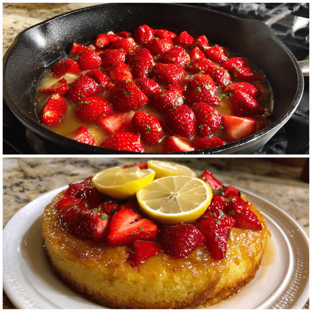 I make Strawberry Lemon Upside-Down Cake when I want an easy dessert that looks stunning. I melt butter and brown sugar in a cake pan, arrange fresh strawberries cut-side down, then spread a fluffy lemon-vanilla cake batter on top. I bake until golden and set, cool for 10–15 minutes, and flip onto a plate so the glossy strawberry topping shines. I serve it warm with yogurt or whipped cream for the perfect sweet-tart balance. This cake tastes like spring: bright lemon, caramelized berries, and tender buttery crumb.