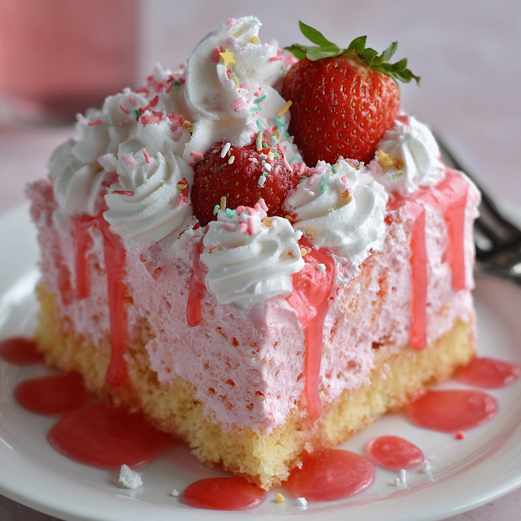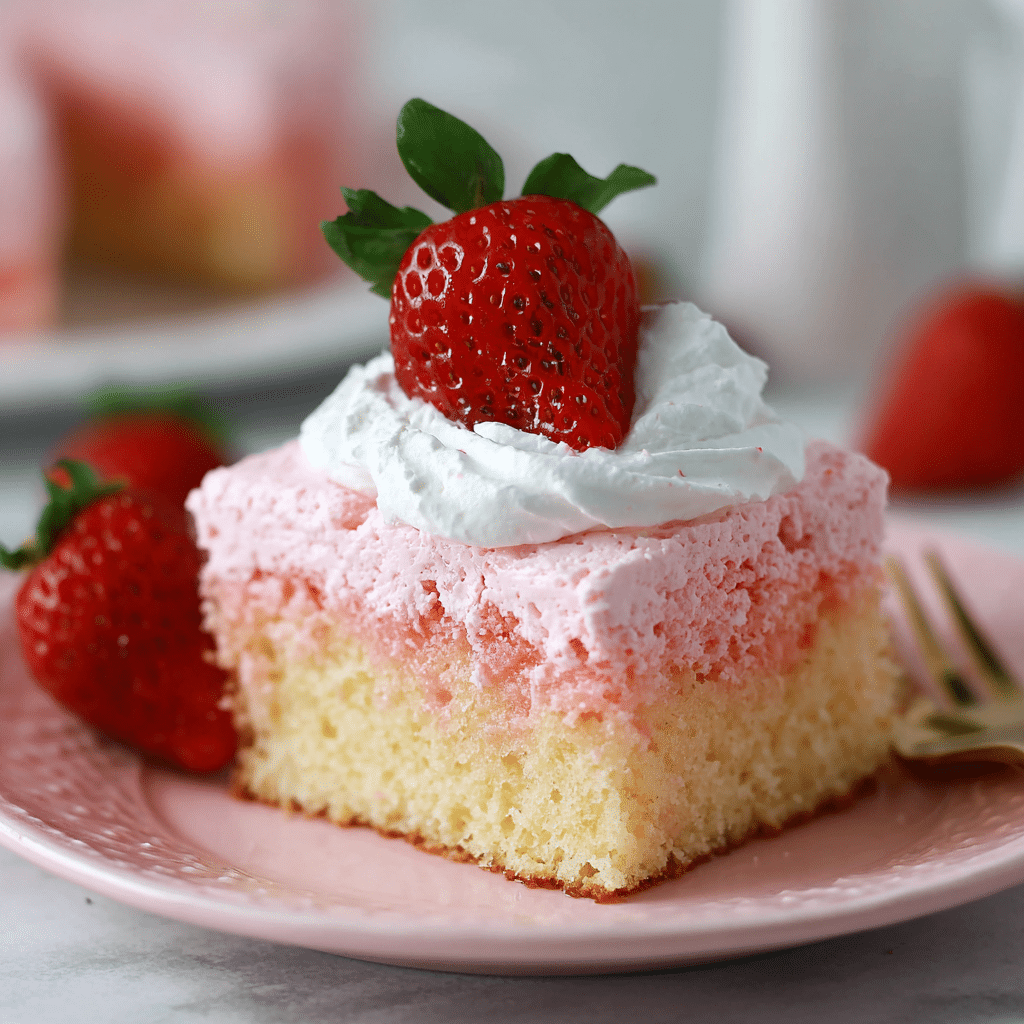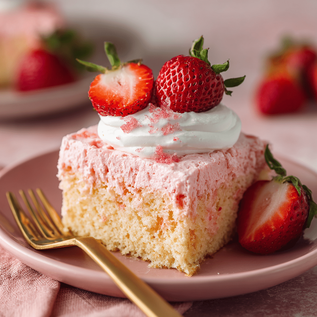 Pour the filling slowly—this helps the cake absorb it instead of pooling. If you can’t find strawberry milk, mix regular milk with strawberry syrup to taste. For homemade whipped cream, beat cold heavy cream with powdered sugar until soft peaks form. Store leftovers covered in the fridge for up to 3 days (this cake tastes even better on day two). Add fresh strawberries right before serving so they stay bright and juicy.