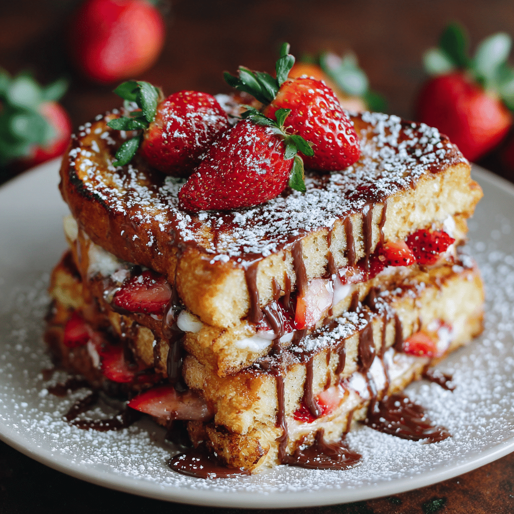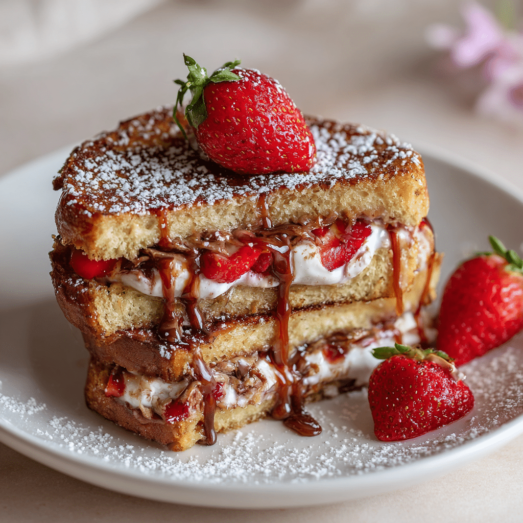 At home, I serve Strawberry Nutella Stuffed French Toast warm, right from the pan. I dust it with powdered sugar and add a few fresh strawberries on the side. Sometimes I drizzle a little honey or maple syrup, but honestly, it doesn’t need much. I serve it with coffee for the adults and warm milk for the children.
