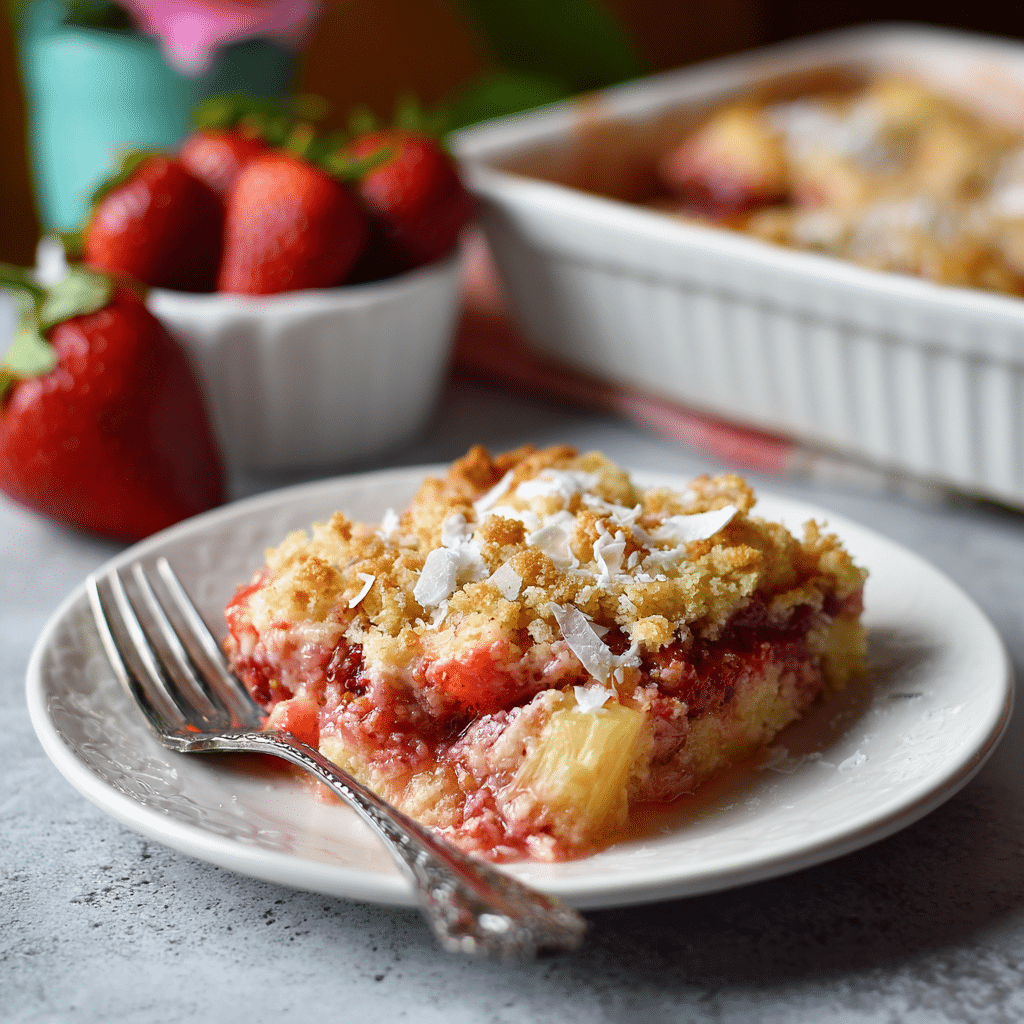 Butter coverage is the secret—thin slices help prevent dry patches of cake mix. For a less-sweet version, use strawberry pie filling labeled “no sugar added” or swap in 3 cups sliced fresh strawberries tossed with 2–3 tbsp sugar and 1 tbsp cornstarch. Add shredded coconut for extra tropical flavor. Store leftovers covered in the fridge up to 4 days. Reheat single servings 20–30 seconds in the microwave or warm the dish in a 300°F (150°C) oven until heated through.