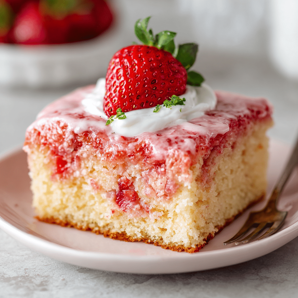 Use ripe, fragrant strawberries for the sweetest flavor. If your berries taste very sweet, reduce the strawberry-syrup sugar to 1/3 cup. If you only have frozen strawberries, thaw and drain them first (save a little juice to replace part of the water). Chill the cake at least 2 hours—overnight tastes even better. For a sturdier topping, whip to medium peaks, but stop before it looks grainy. Store covered in the fridge for up to 4 days. For best texture, add the whipped cream and fresh strawberry topping the day you serve it (you can bake and soak the cake a day ahead).