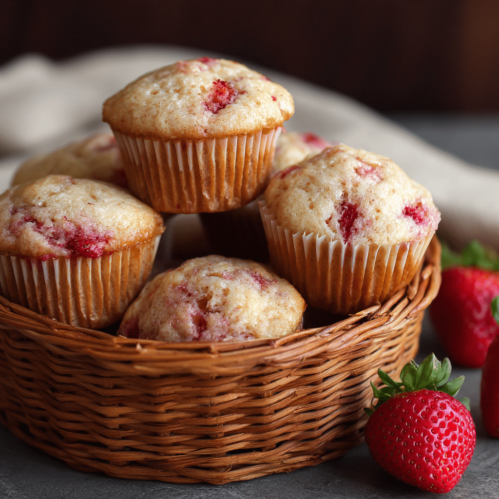 Use ripe, fragrant strawberries for the best flavor. Don’t overmix the batter—gentle folding keeps muffins fluffy. For a lighter muffin, replace 1/4 cup of the oil with 1/4 cup plain Greek yogurt. Store airtight at room temperature for up to 3 days or refrigerate up to 5 days. Freeze (wrapped) up to 2 months; thaw at room temp or warm 10–15 seconds in the microwave.