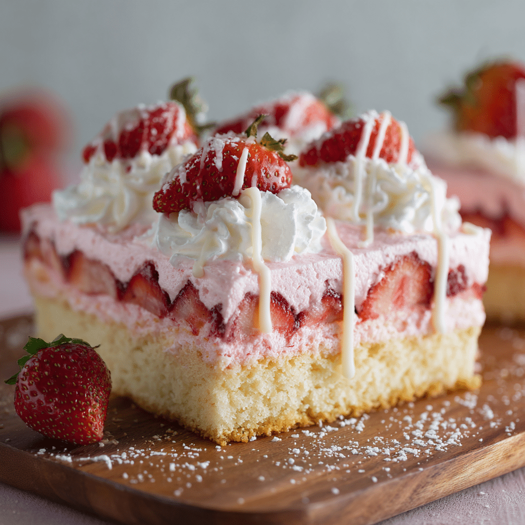 Use ripe strawberries for best flavor. Chill well before slicing for clean layers. Store refrigerated up to 3 days.