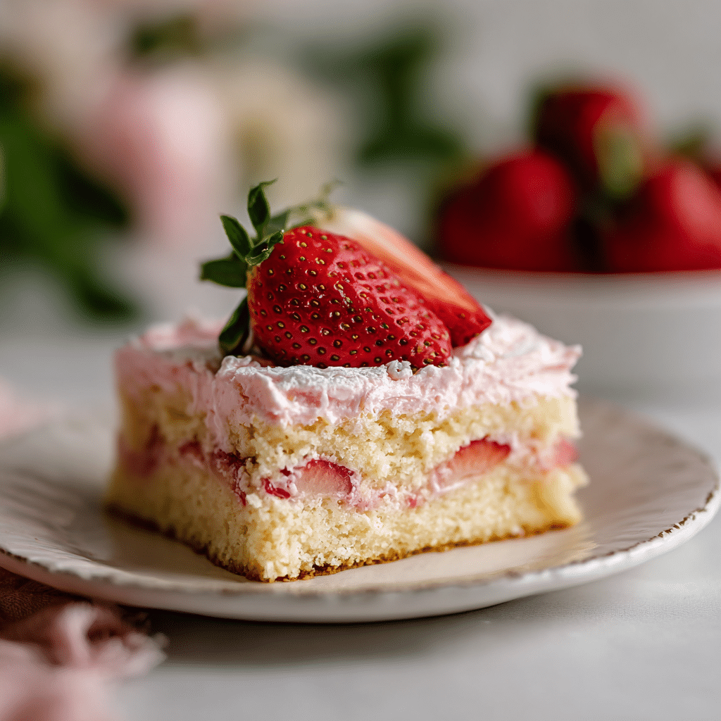 For birthdays or celebrations, I decorate the top with whole strawberries and mint leaves. It becomes elegant but still feels homemade and comforting.