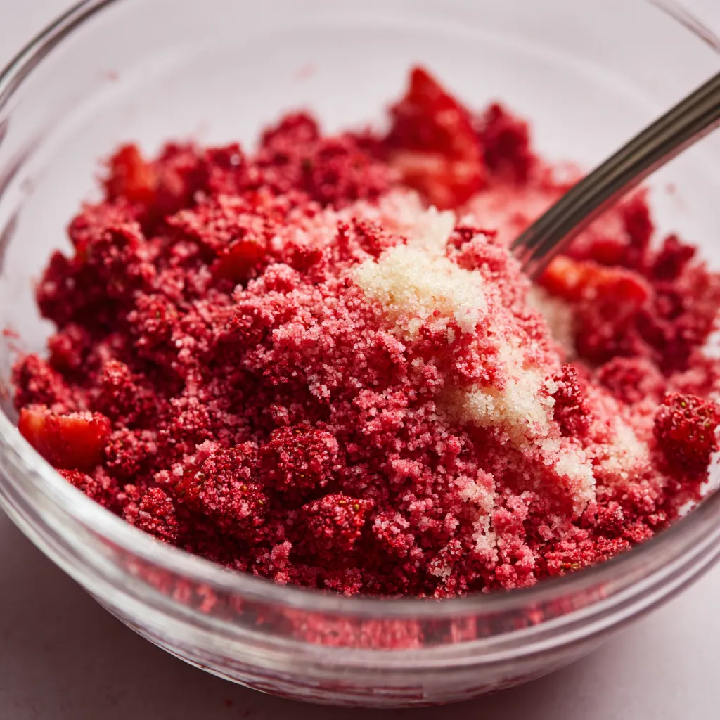 Make the crumble: Mix crushed freeze-dried strawberries, flour, sugar, and melted butter until crumbly.