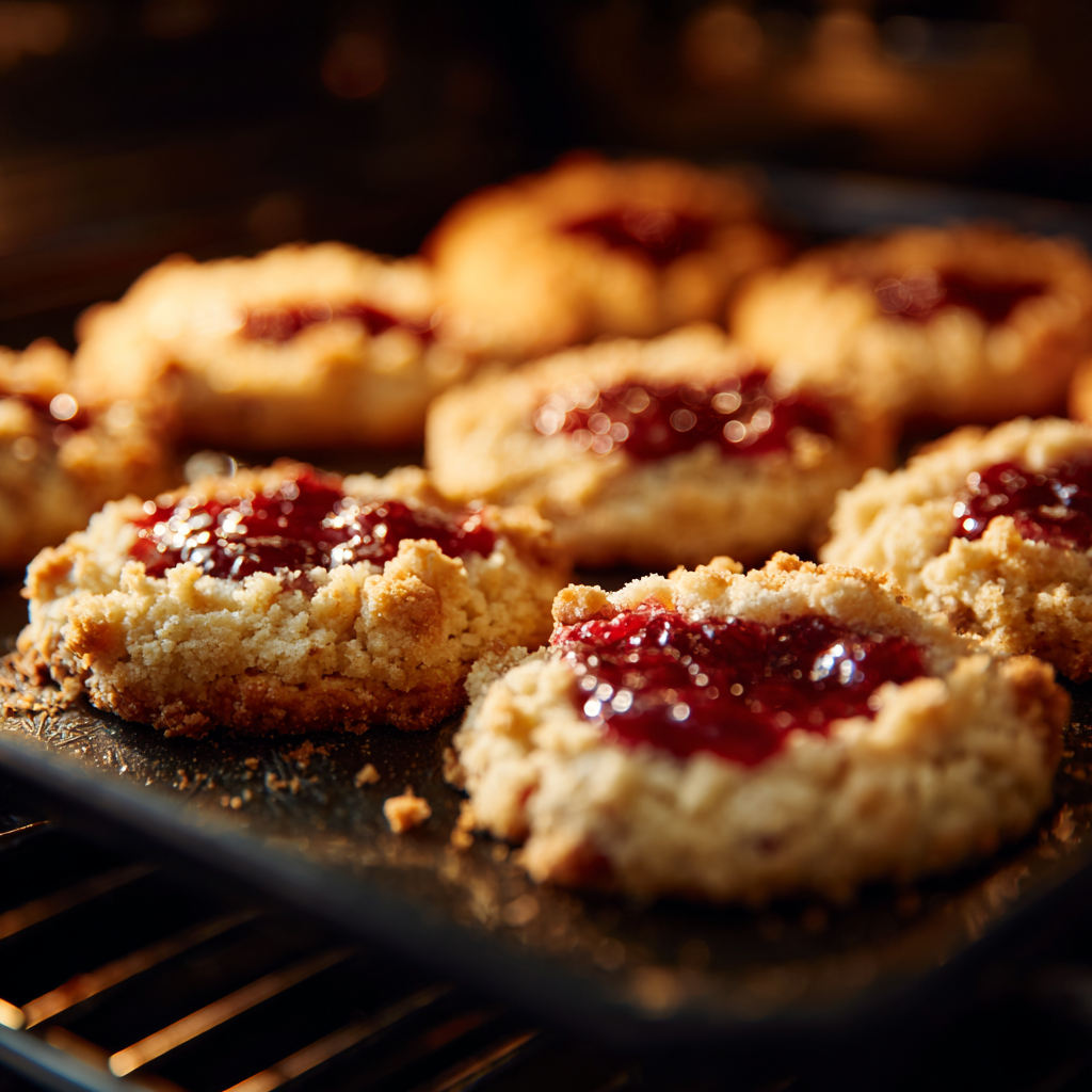 Assemble cookies: Scoop dough into balls, flatten slightly, add a teaspoon of strawberry jam in the center, and sprinkle with crumble.
