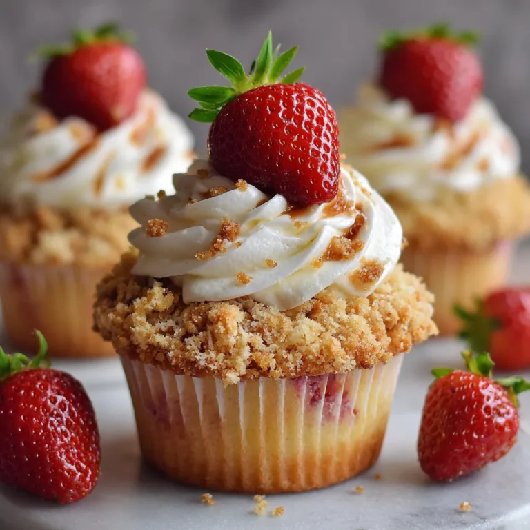 Cut a small hole in the center of each cupcake and fill it with a spoonful of strawberry compote. Pipe the frosting over the top, then sprinkle the crunchy topping generously. Garnish with a fresh strawberry slice for the perfect finish!