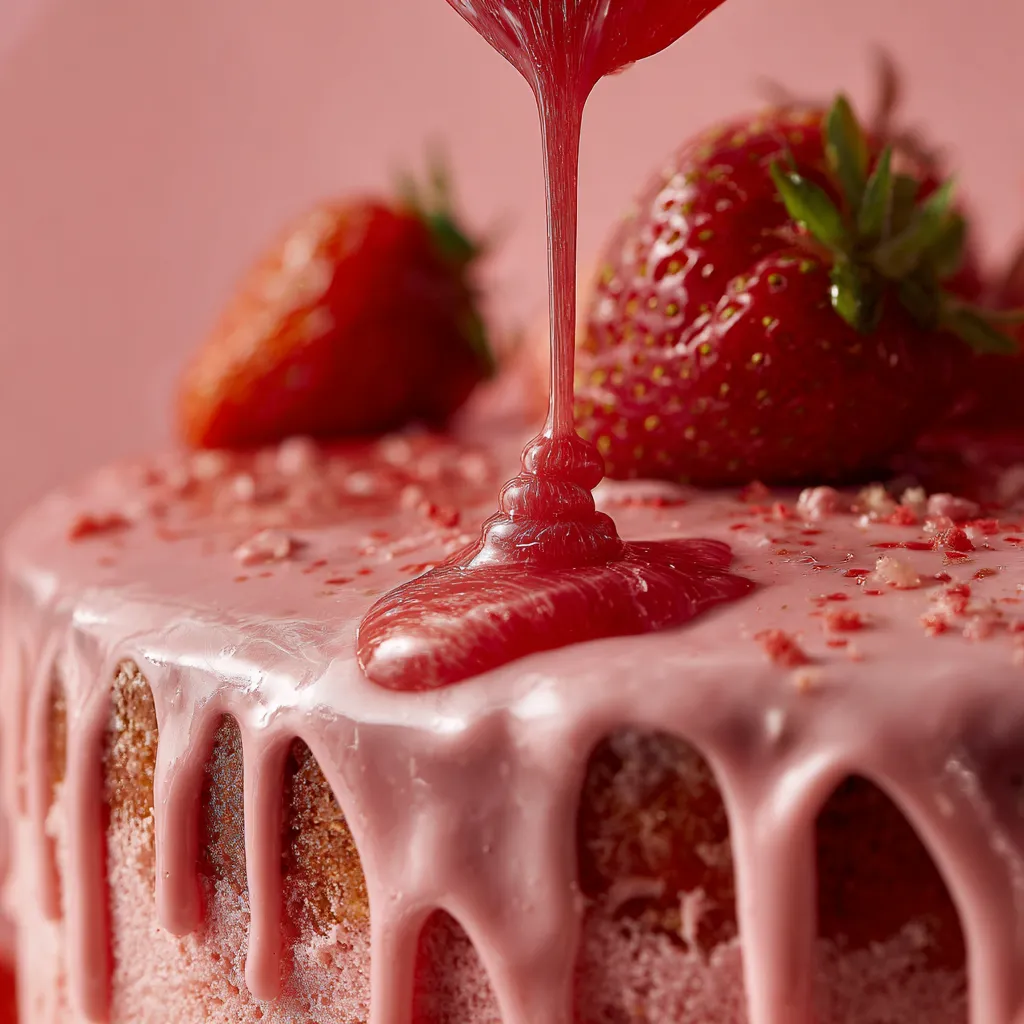 Warm strawberry puree, add white chocolate and cream, mix until smooth. Cool slightly, then drip over cake edges. Decorate with fresh strawberries and crumbs.