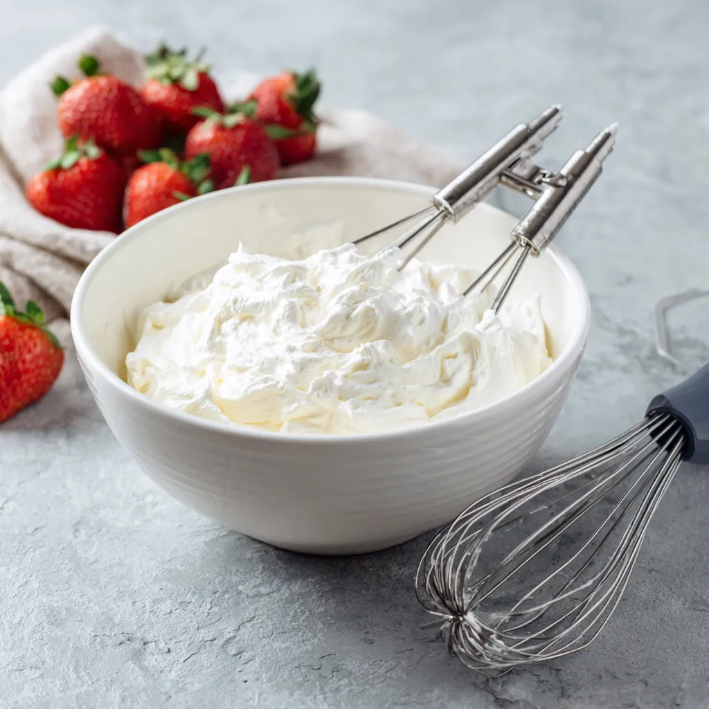 In a chilled bowl, beat heavy cream, powdered sugar, and vanilla extract until stiff peaks form. Be careful not to overbeat. Keep chilled until needed.