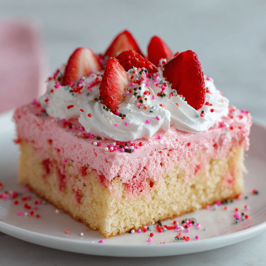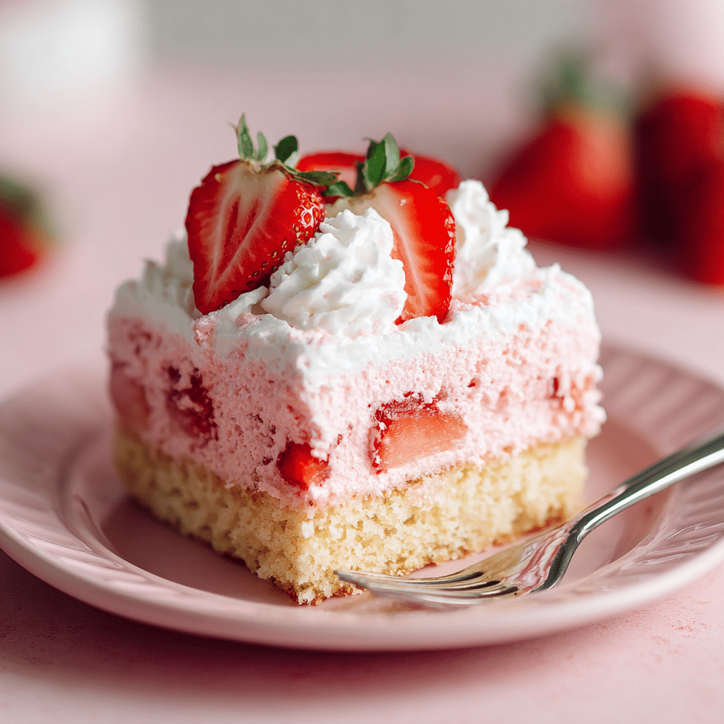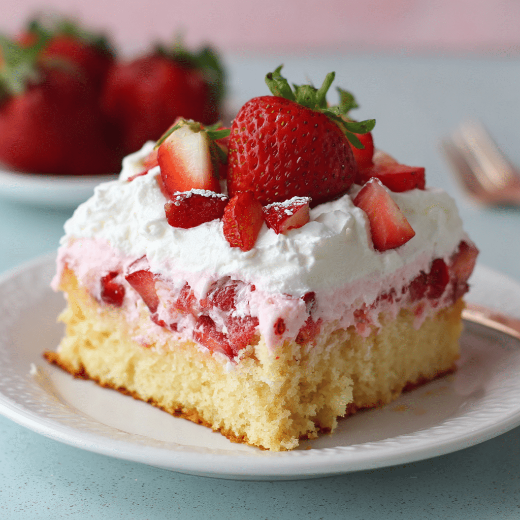 I bake a soft vanilla sheet cake, then poke holes all over it while it’s still warm. I dissolve strawberry gelatin in boiling water, stir in cold water and strawberry puree, and pour it slowly over the cake so it soaks into every hole. I chill the cake until the strawberry layer sets. Then I whip cold heavy cream with powdered sugar and vanilla until fluffy and spread it over the chilled cake. I finish with fresh sliced strawberries. I serve it cold for the best texture, clean slices, and bright strawberry flavor.