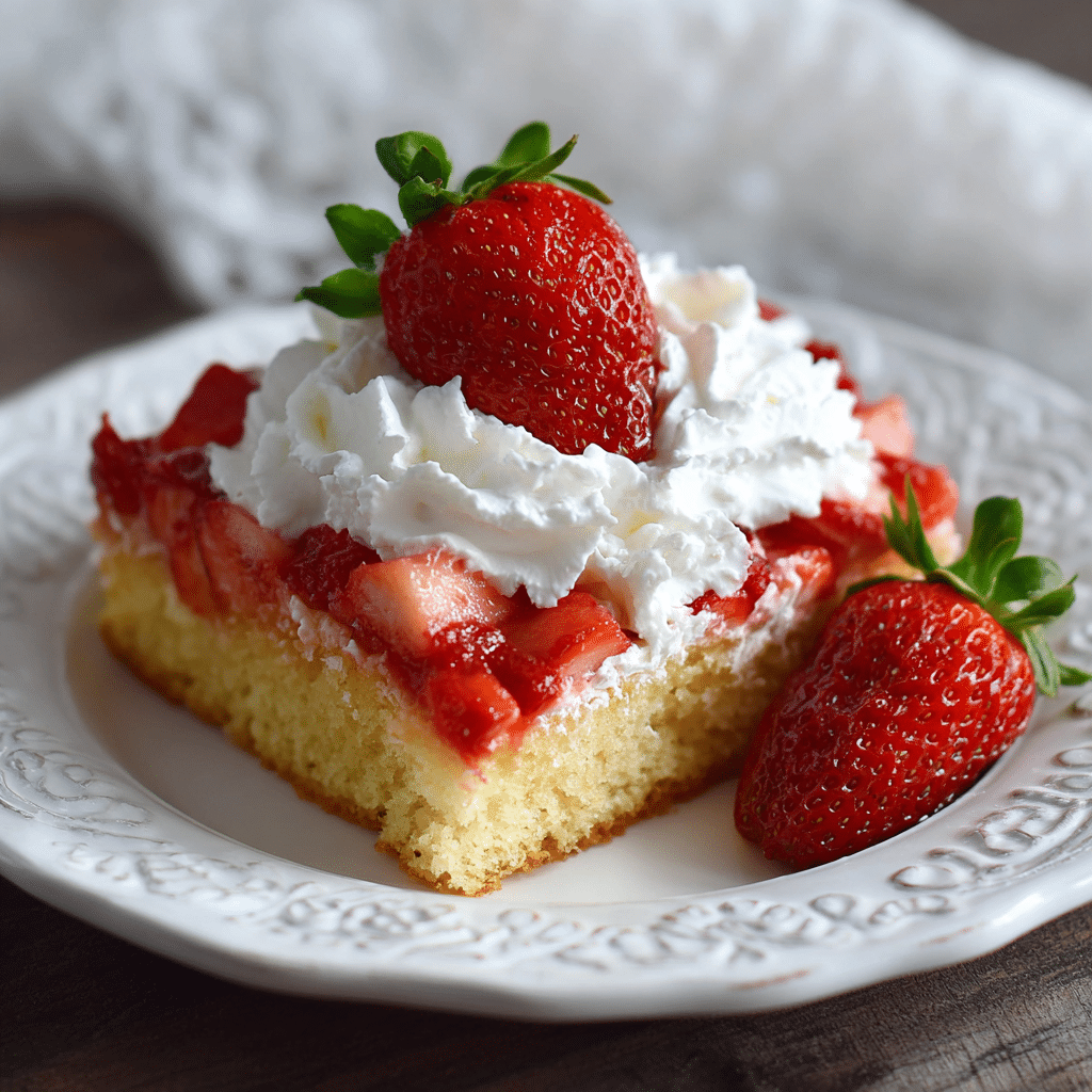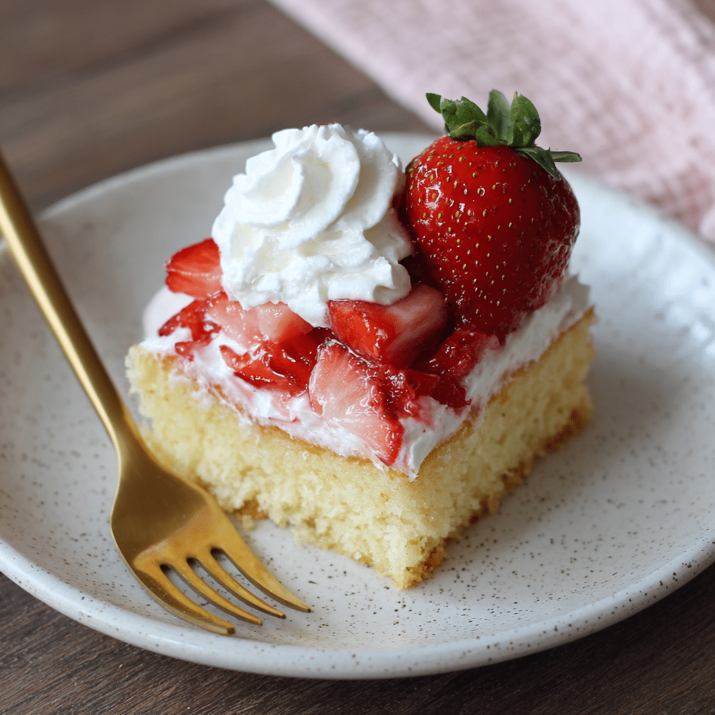 Use ripe, fragrant strawberries for the sweetest flavor. Letting them macerate (rest with sugar and lemon) creates a natural syrup that makes the cake taste like classic strawberry shortcake. Chill your bowl and beaters before whipping cream for the fluffiest results, and avoid overwhipping so it stays silky. For a more stable topping in warm weather, add 1 tablespoon instant pudding mix to the whipped cream. Store leftovers covered in the refrigerator for up to 3 days. I don’t recommend freezing once assembled because the whipped cream texture changes.