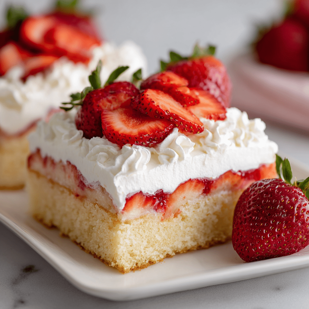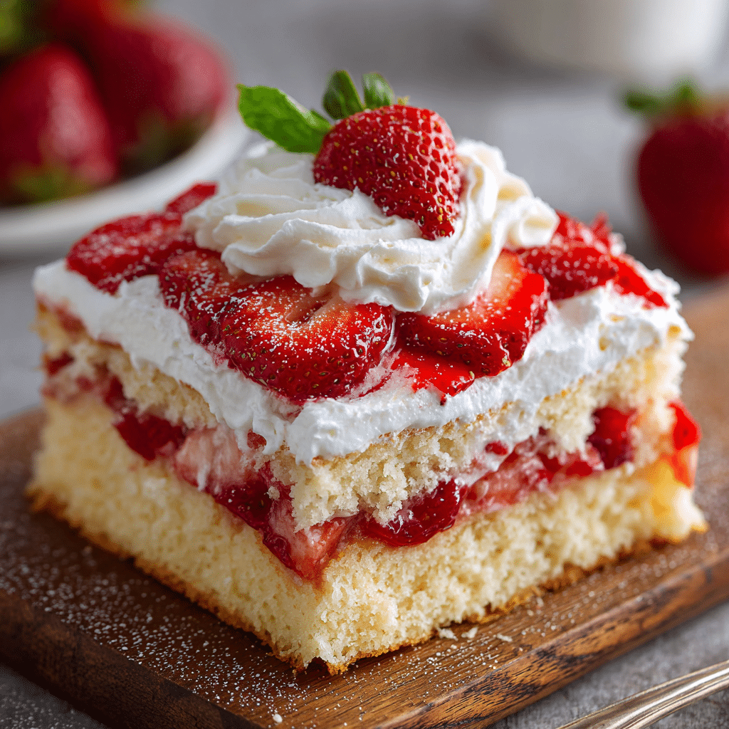 Use the sweetest, ripest strawberries you can find—taste one first and adjust the strawberry sugar if needed. Keep the whipped cream soft (stop at soft peaks) for the most tender topping. Make-ahead tip: bake the cake up to 1 day ahead, cover at room temperature, then top with strawberries and whipped cream the day you serve. Storage: cover and refrigerate up to 3 days. Freezing: freeze the plain baked cake (no toppings) tightly wrapped up to 2 months; thaw overnight in the fridge and top fresh.