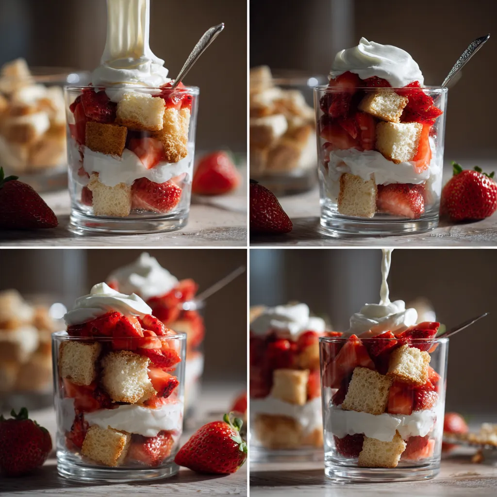Start by layering cubed cake pieces at the bottom of each cup. Spoon over a layer of the sweetened strawberries with their syrup. Add a generous dollop of whipped cream. Repeat the layers until the cup is filled, ending with whipped cream on top.