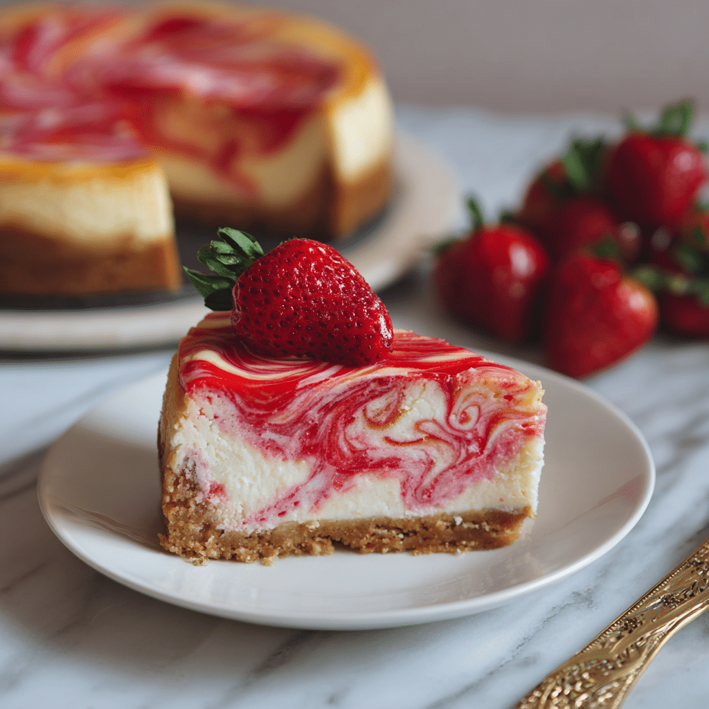 I make this Strawberry Swirl Cheesecake Recipe with a buttery graham cracker crust, a creamy vanilla cheesecake filling, and a homemade strawberry sauce swirled on top. I bake the crust briefly, cook strawberries with sugar and lemon into a thick sauce, then blend it smooth and cool it completely. I mix cream cheese with sugar, sour cream, cream, vanilla, and eggs gently. I swirl the strawberry sauce into the batter, bake in a water bath until set with a slight wobble, cool slowly, and chill overnight. It slices beautifully and tastes even better the next day.