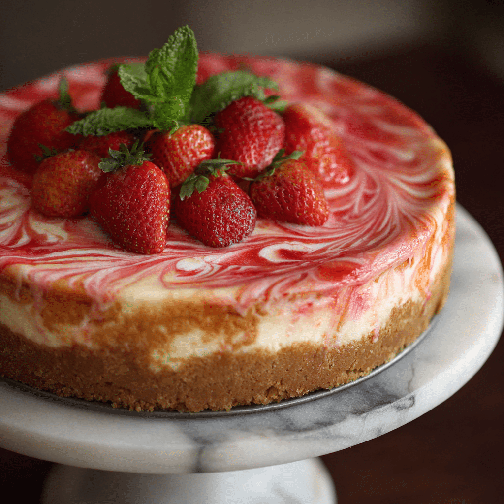Use room-temperature ingredients for the smoothest, creamiest cheesecake. Mix gently after adding eggs to avoid incorporating excess air, which can cause cracks. Cool slowly (oven off, door cracked) to protect the top. Store covered in the refrigerator up to 5 days. Freeze slices individually up to 2 months and thaw overnight in the fridge. Swap strawberries for raspberries or blueberries for a different swirl.