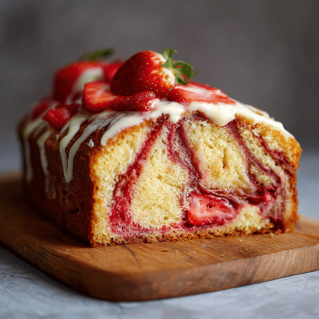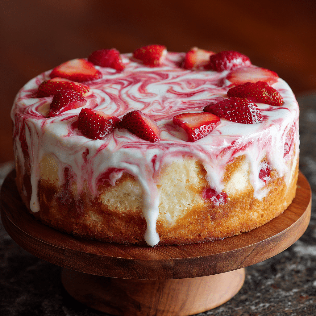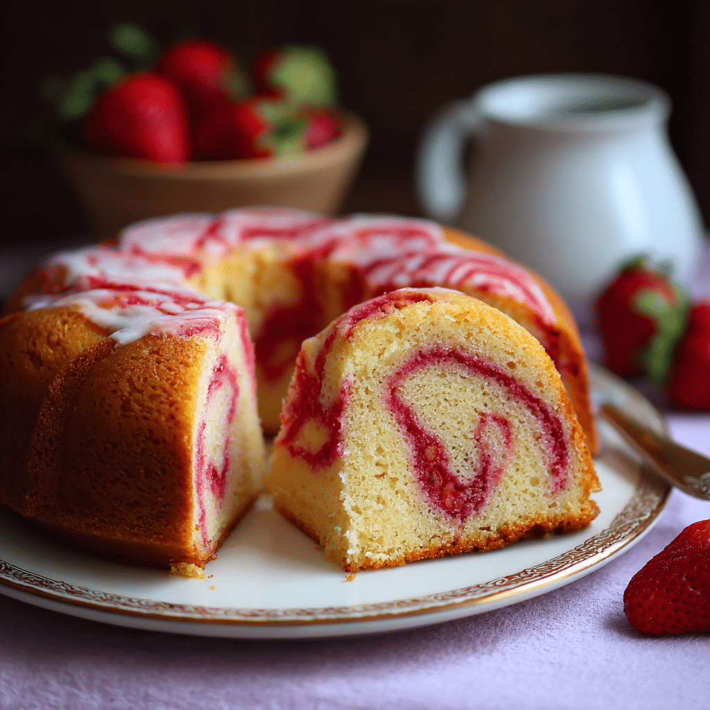 Allow the strawberry swirl to cool completely before adding to the batter to prevent sinking. Avoid over-swirling to maintain distinct strawberry ribbons. Store cake in an airtight container at room temperature for up to 2 days or refrigerate for up to 5 days. Freeze individual slices wrapped tightly for up to 2 months. Serve with whipped cream or fresh strawberries for extra freshness.