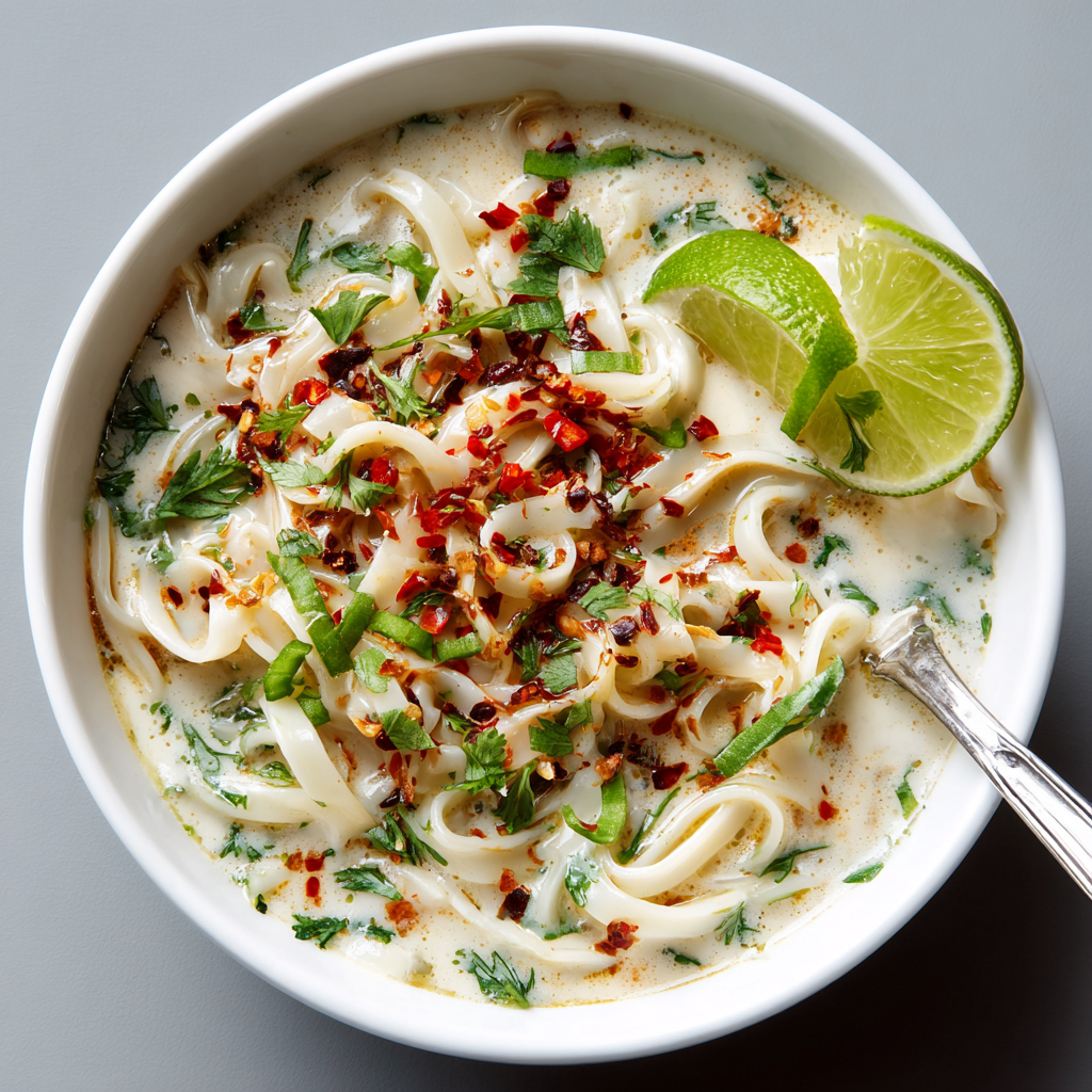Ladle the soup into bowls. If you love spice, sprinkle extra chili or red pepper flakes. The combination of creamy coconut broth, lime, herbs, and tender noodles is pure comfort.