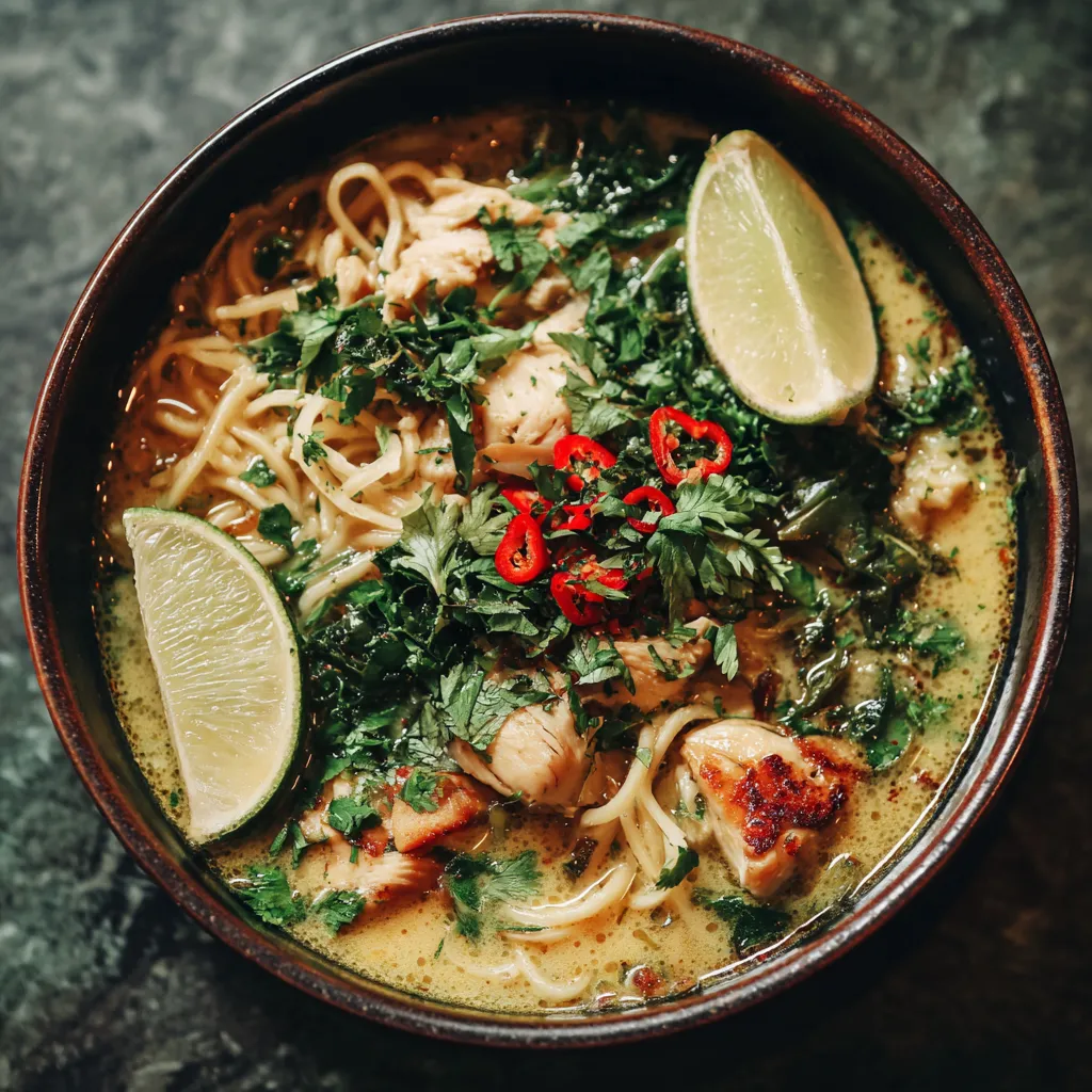 All ingredients for the broth, coconut base, chicken, noodles, and fresh herbs listed above.