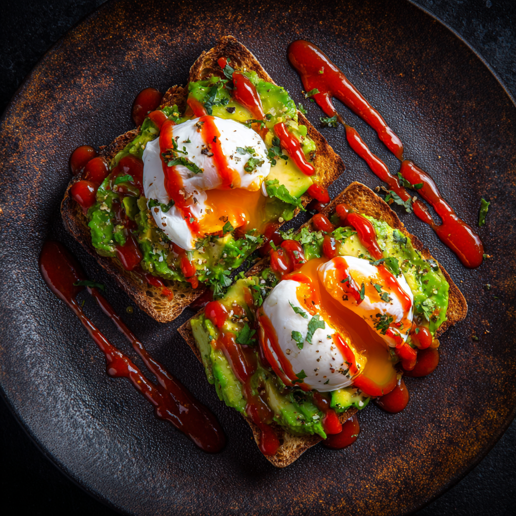 The beauty of this dish is its balance rich poached eggs, creamy avocado, crunchy toast, and a fiery bite of hot sauce. It’s comfort food with attitude.
